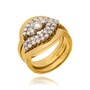 This cluster style diamond engagement ring is crafted in beautiful gold and is perfectly accompanied with its matching fitted jacket. It is centered with a round brilliant cut diamond that rests between two smaller diamonds creating a 3-stone effect. A bypass inspired swirl reaches from both sides to wrap in a double row around the top and bottom of the three center stones. Each of the two inside rows contain eight diamonds and each of the two outer rows contain nine. All of the diamonds are set within rhodium finished settings and all combine for 1.00 full carat. The cluster ring fits perfectly into a yellow gold jacket that wraps around the cluster on both sides.