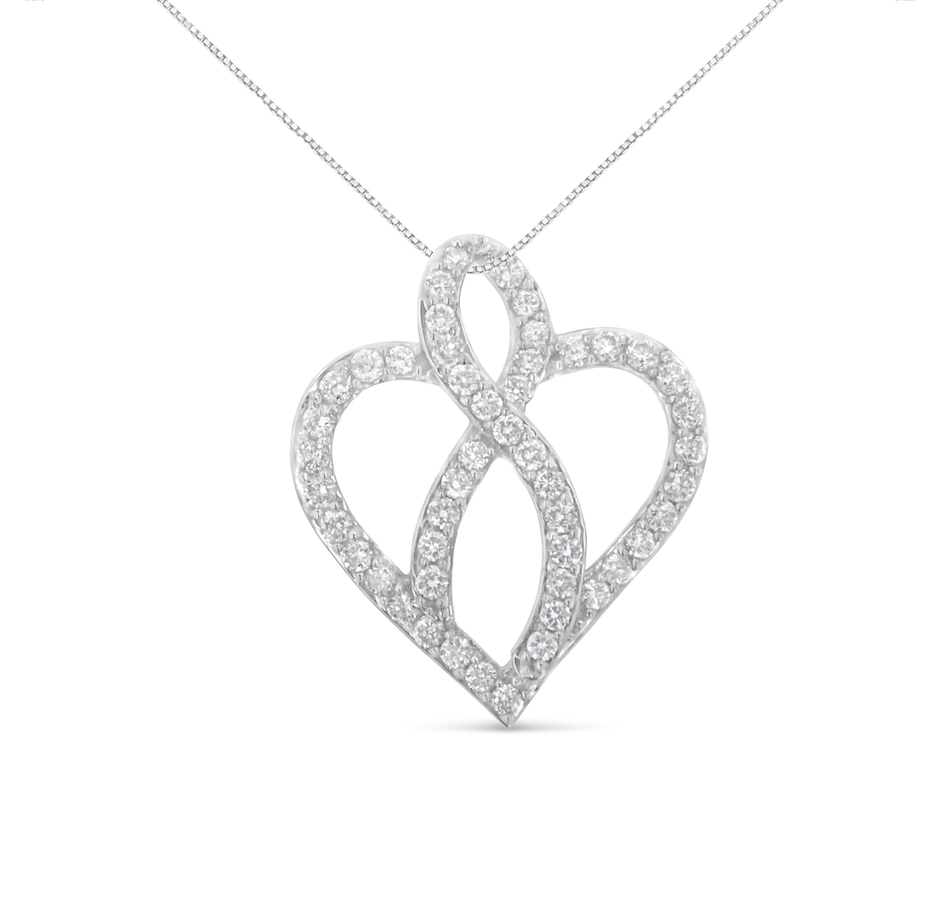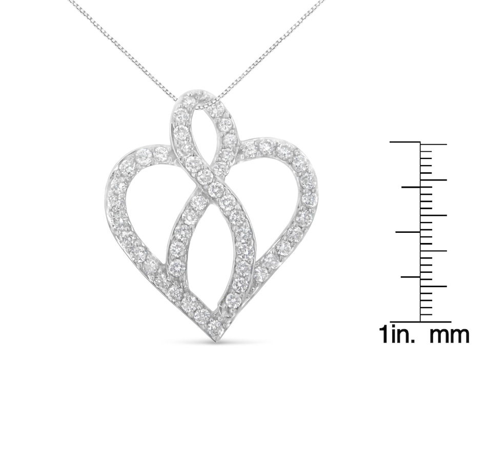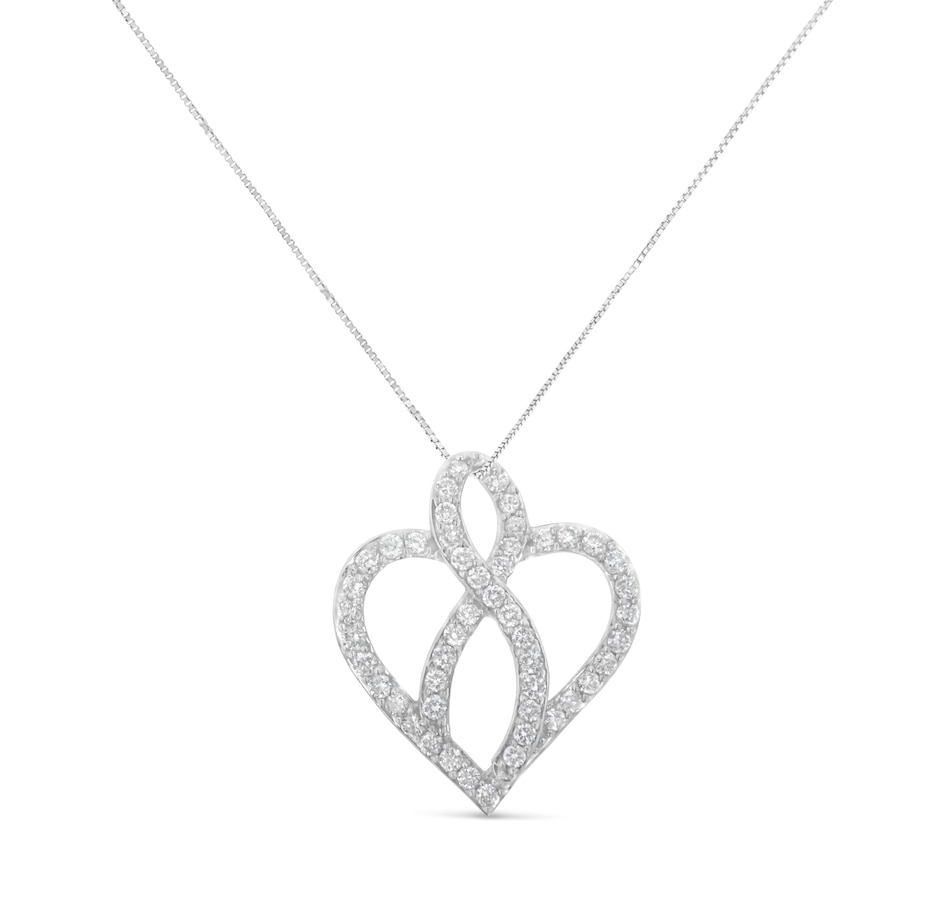 This lovely 14k white gold heart pendant necklace features 1 carat of beautiful, natural diamonds. The heart is intersected with a ribbon at its center, and both motifs are embellished with round-cut diamonds in an elegant prong setting. This pendant hangs from a box chain and will add the perfect amount of sparkle to your everyday wear.
