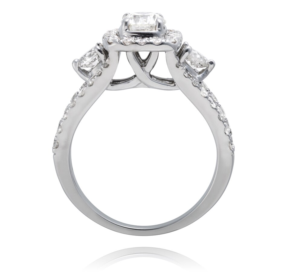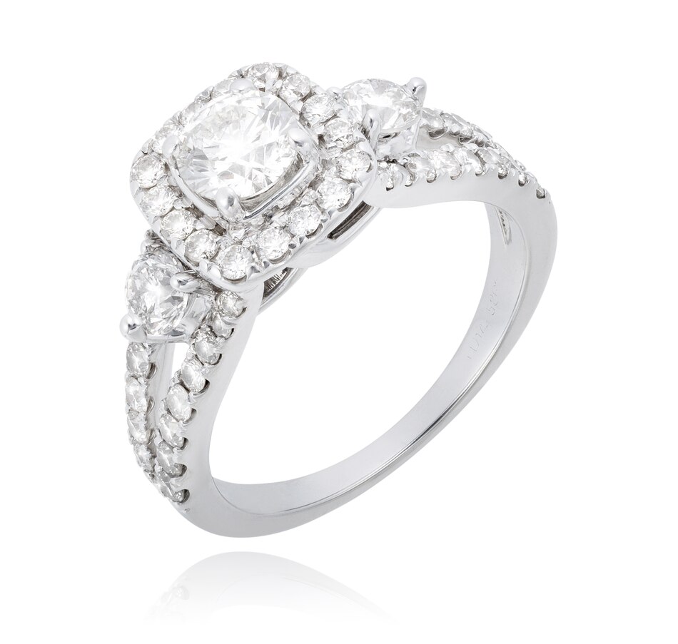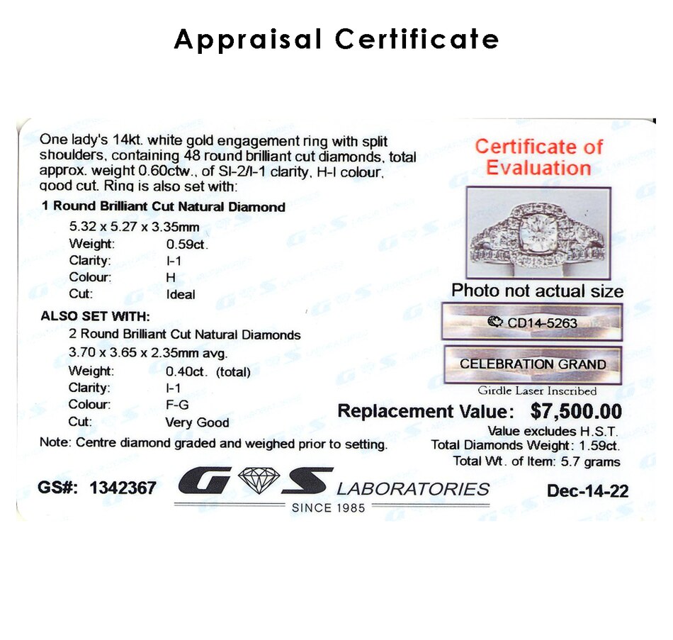 This dazzling ring is centered with a round brilliant cut diamond, at its center. A halo of sixteen round brilliant cut diamonds surround the center diamond in a cushion shape. An additional sixteen diamonds, eight per side form each split shoulder. Nestled at the top of the split shank, just below the halo is a larger prong-set diamond, on each side. All of the diamonds display very good colour, ranging from F-G to H-I. The girdle of the diamond is laser engraved with ""CD14-5263"" on one side and "CELEBRATION GRAND" on the other. The CD indicates that it is a Canadian diamond.