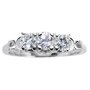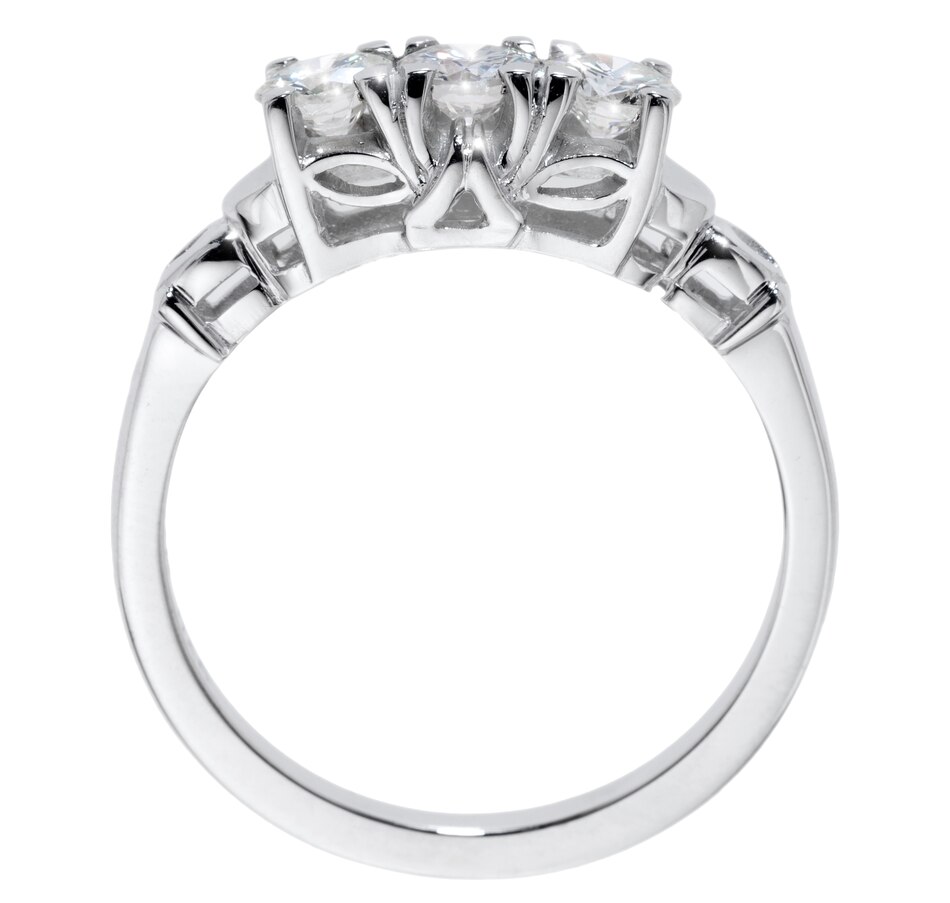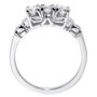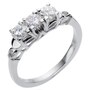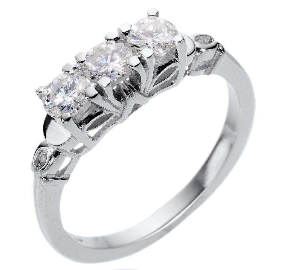 This ring's impressive presence is a result of a striking body of 14kt white gold, elaborately designed with artful shoulders and undergallery and a stunning display of three round brilliant cut diamonds. The three diamonds are similar in size and are arranged in a trinity styling or what is commonly referred to as a 3-stone across. Each stone is 4-prong-set and crown a pierced undergallery with triangle and marquise shapes. A high polished half moon caps the diamonds on each shoulder, leading to a horseshoe detail and high polished band. The diamonds are VS-2 - SI-1 clarity, G-H-I colour and combine for .90 carats. The 3-across style can be interpreted as the 'past, 'present' and 'future' and is exactly what it sounds like. The three stones represent a different period of the relationship. The center stone traditionally represents the current relationship whereas the side stones represent both the past and the future which is why the trilogy ring is as important as an engagement ring as it is an anniversary ring. Today, women embrace these rings as self purchases commemorating special achievements.