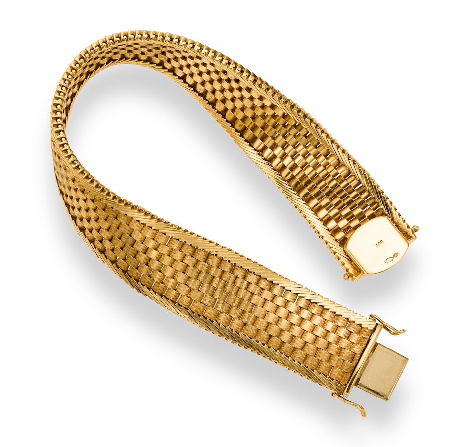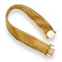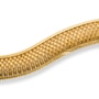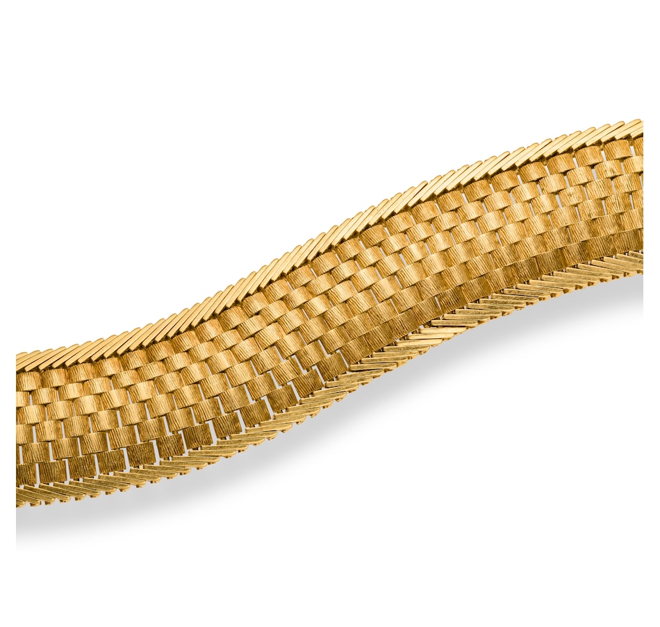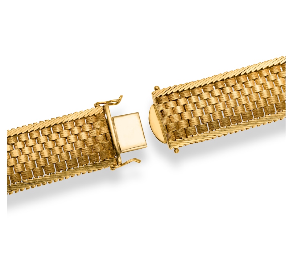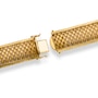 This wide slinky gold bracelet features a 6-row basket weave pattern through the middle. Each link is domed, front and back, with a ribbed texture showing personality on the front. An angled zipper inspired detail dons the top and bottom while providing contrast and the perfect edge to the basket weave pattern within. A hidden box clasp with double safety latch secures the bracelet upon the wrist.