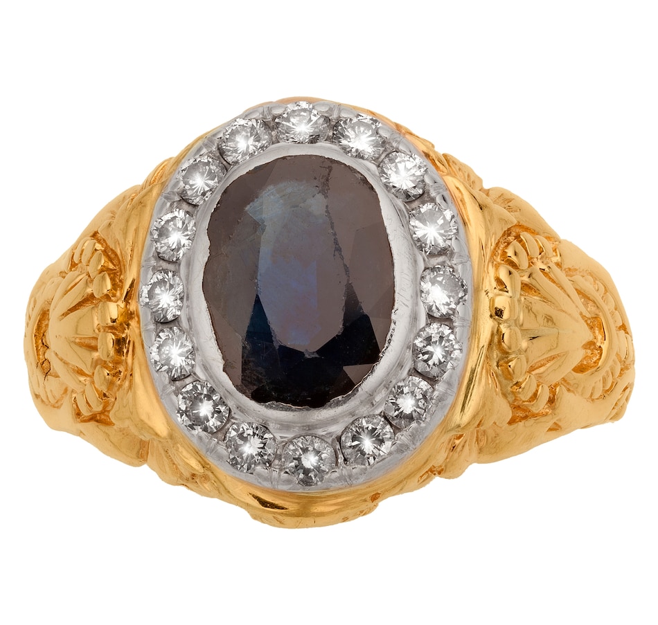 Specs: (1) oval shaped sapphire (2.60ct), (16) round brilliant cut diamonds (.52ctw)