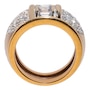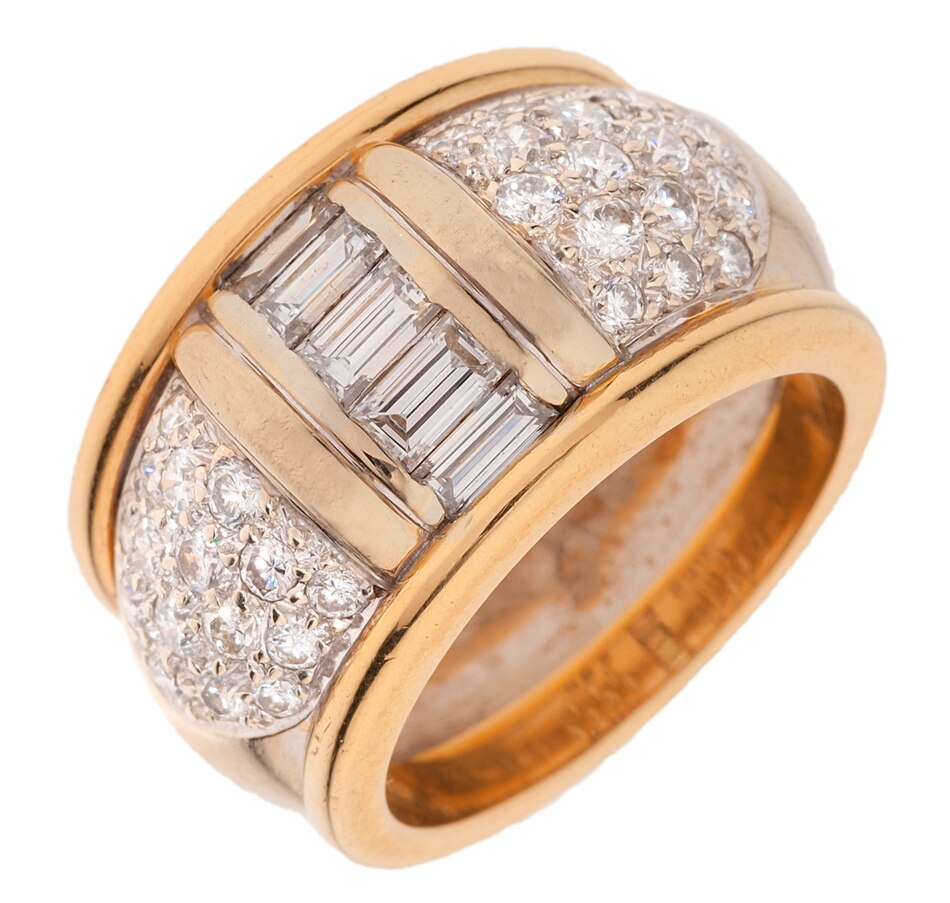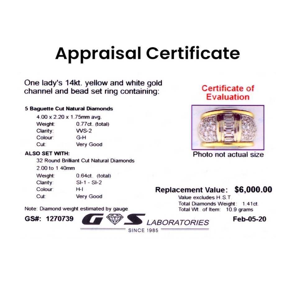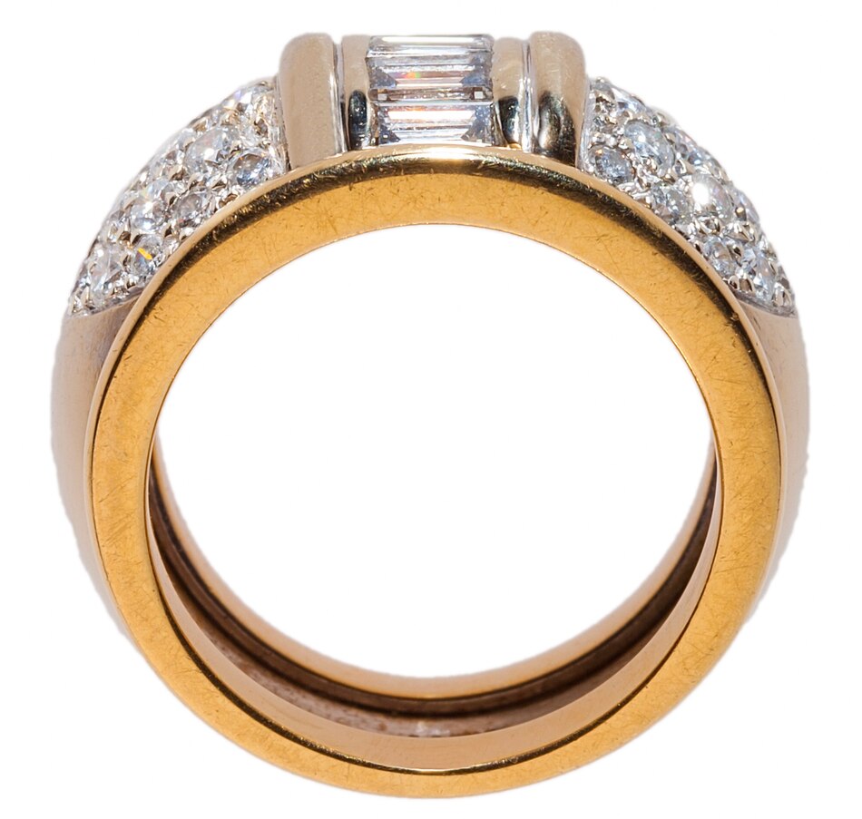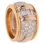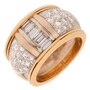 This unique band style ring provides a dome-like appearance as it reaches knuckle to knuckle on the finger. A high polished rounded frame caps the elaborate middle on both the top and bottom. The middle section is centered, in 14kt white gold, with a vertical row containing five baguette cut diamonds, channel-set with a ridged design border on each side. The baguettes are excellent quality with VVS-2 clarity and G-H colour. To both the right and left of the baguettes are sixteen bead set round brilliant cut diamonds arranged to neatly fill the 'U' shaped design within the dome. These thirty-two diamonds combine for .64 carats while the baguettes provide an additional .77 carats bringing the total diamond weight to 1.41 carats. A high polished 14kt yellow gold band tapers slightly as it rounds the finger and allows no interruption of the outside frame. Please note: if the ring were to be sized, it may interrupt the ribbing around the back.