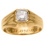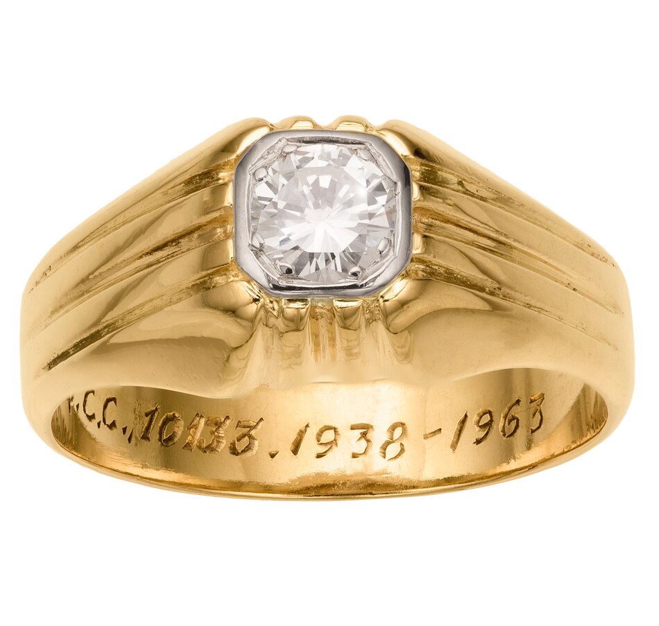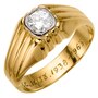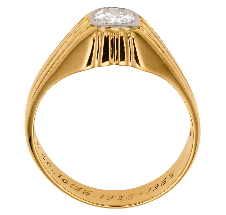 This dazzling ring is suitable for either a man or woman with its handsome presence. It is centered with a .36 carat round brilliant cut diamond that is prong-set within a cushion shaped, white gold bezel creating the illusion of a fancy cut diamond. Displaying excellent quality (VS-1 clarity and colourless F-G colour), this ring sparkles with maximum brilliance. The setting gradually inclines to rise .5mm above the finger and displays ribbing on the shoulders and at the front and back positions. Well protected, this ring is ideal for everyday wear. Please Note: the ring is engraved 'M.S., T.E.Q.C.C., 10133. 1938 - 1963' inside the shank which can be polished out but adds to the intrigue of the piece.