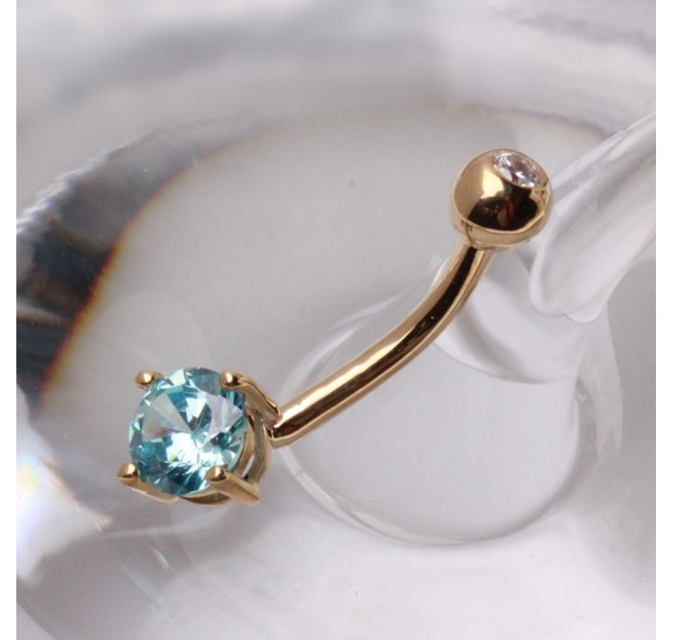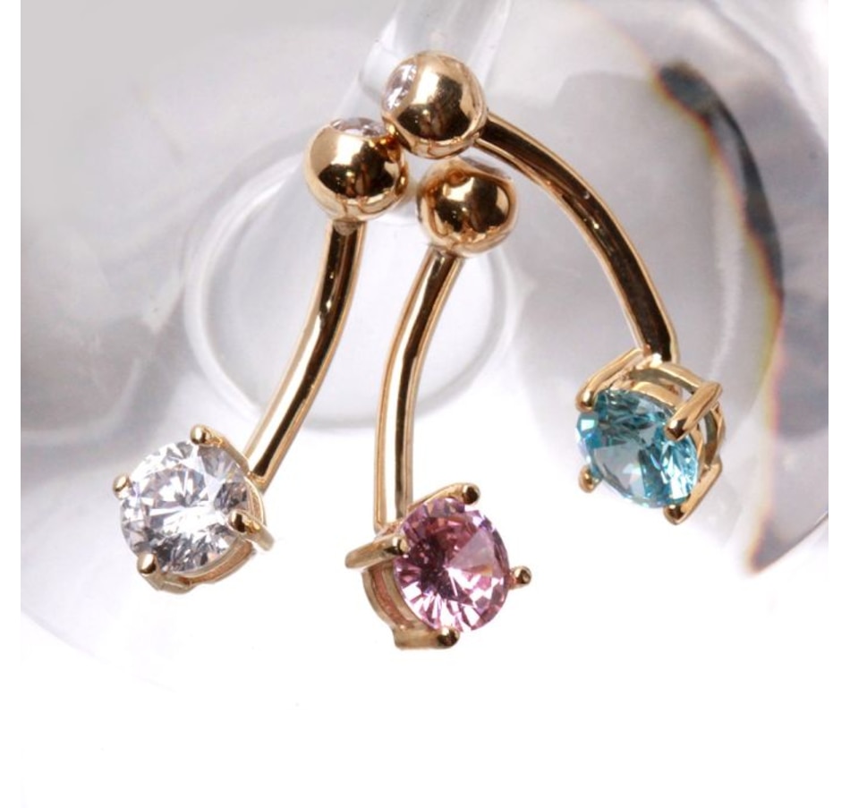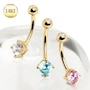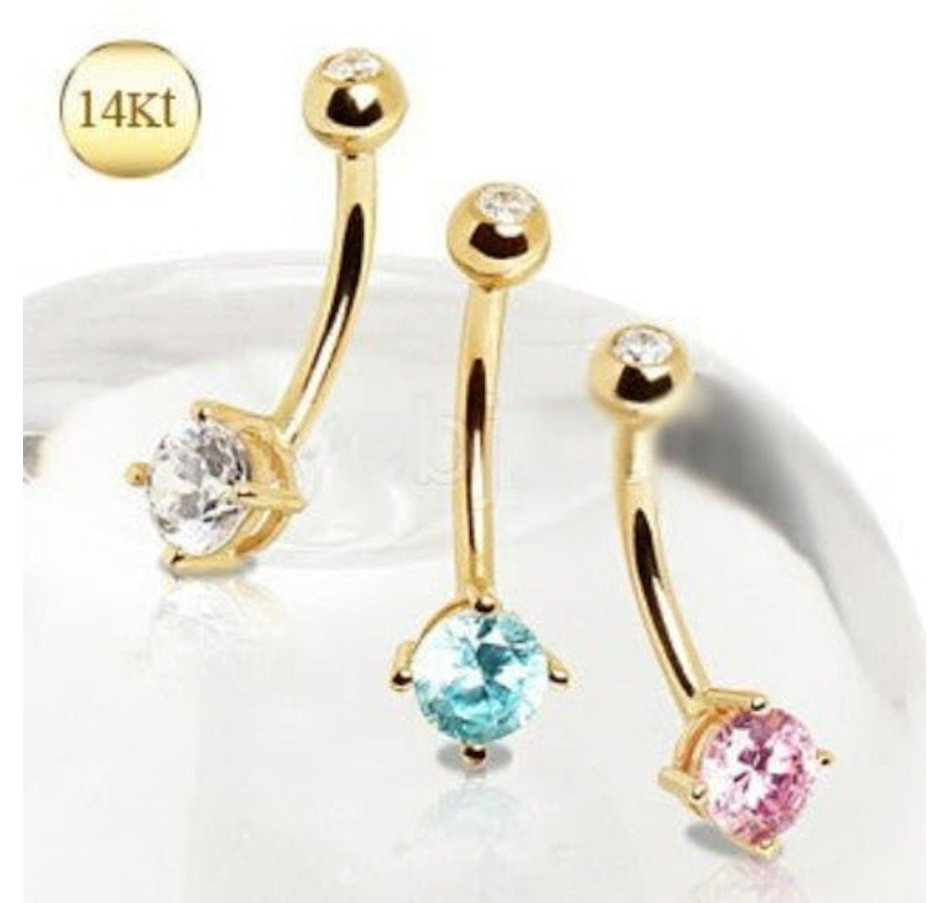14Kt Gold Navel Ring with Prong Set Round CZ.14 Kt. Yellow Gold Belly Button Ring/Navel Ring with prong set Round Cubic Zirconia.4mm Top ball also has press fit Clear Cubic Zirconia.Internally threaded top ball with externally threaded pin.Thickness : 14Ga / 1.6mmLength : 3/8" / 10mm