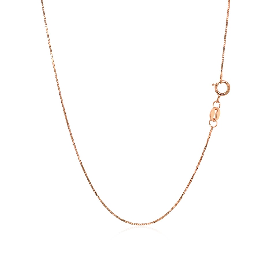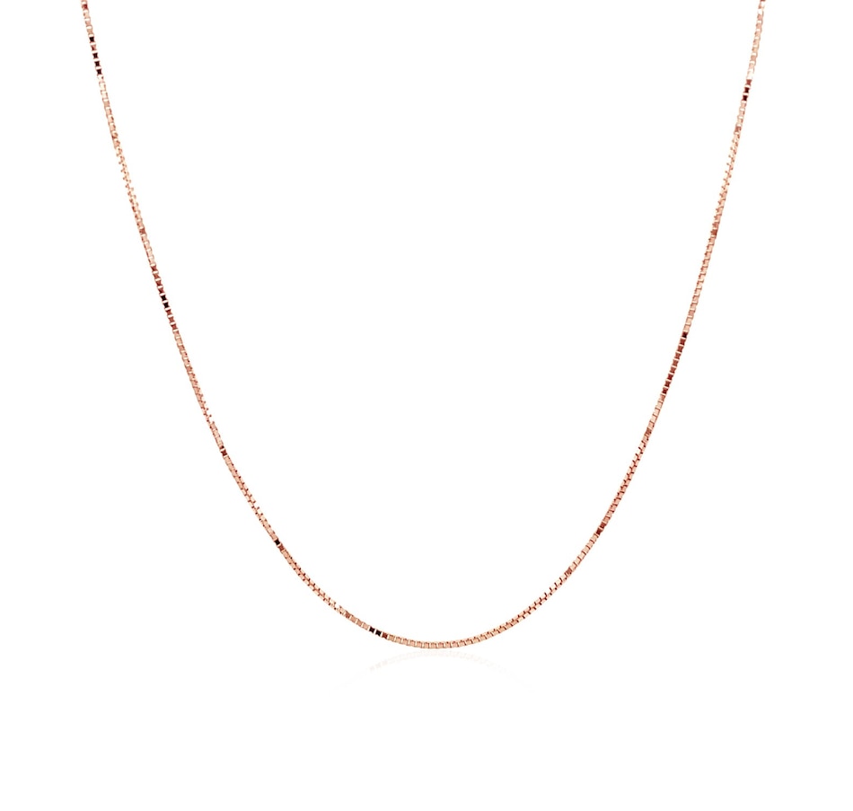 This classic box chain comes in 14k rose gold and has a width of 0.6 millimeters.