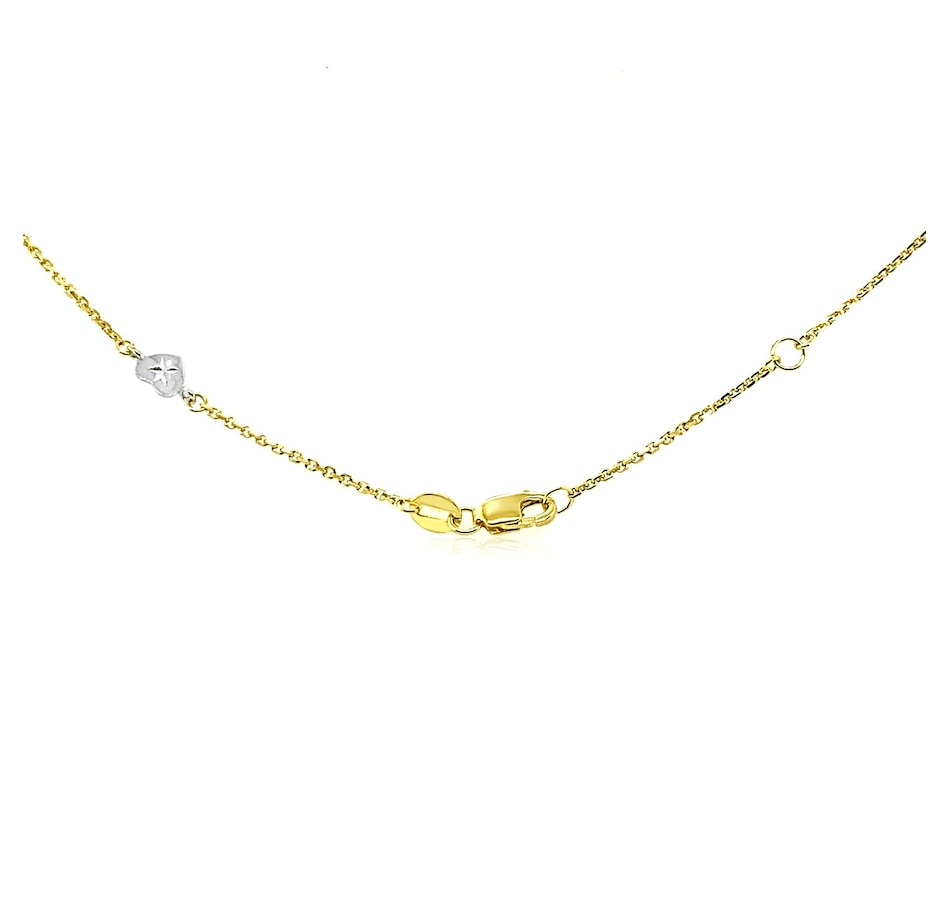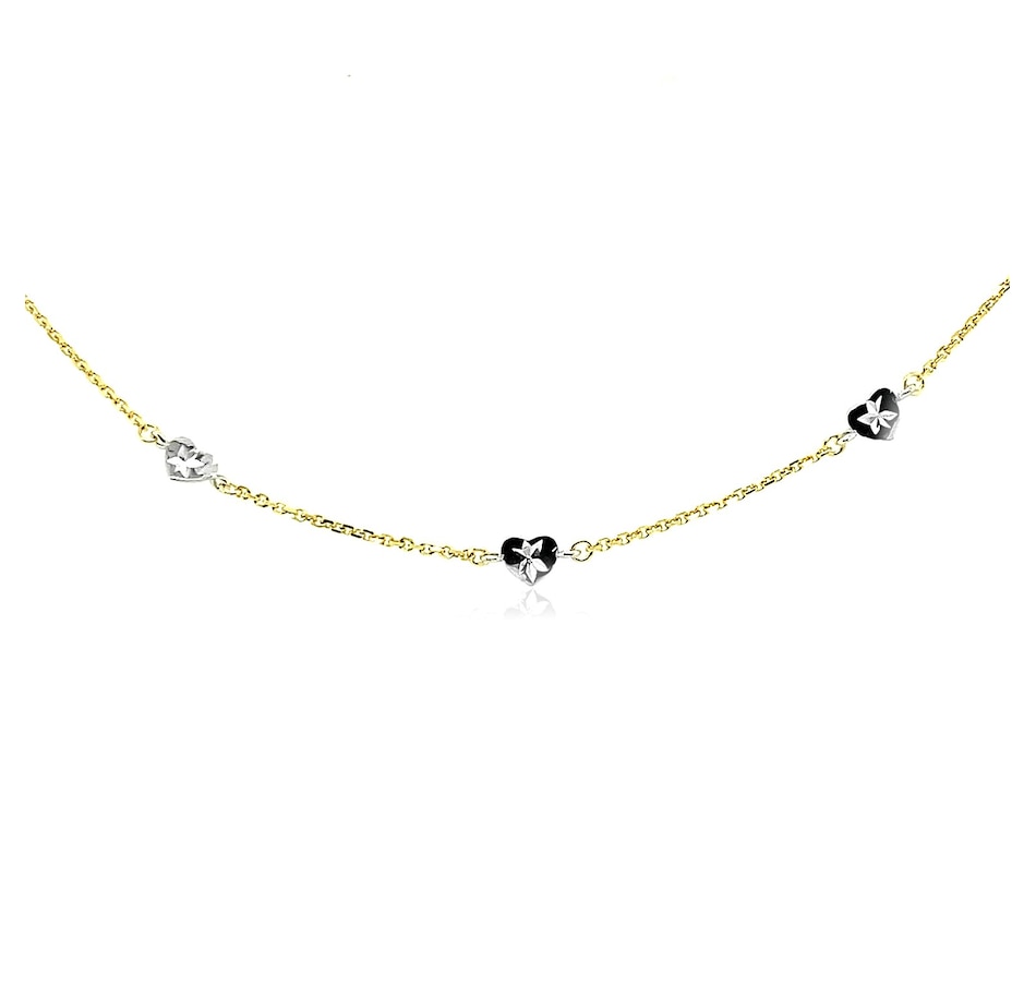 A stunning 14k two-tone gold anklet with white gold diamond cut heart stations and a lovely yellow gold chain. A truly elegant piece measuring 10 Inches and secured with a lobster style lock.
