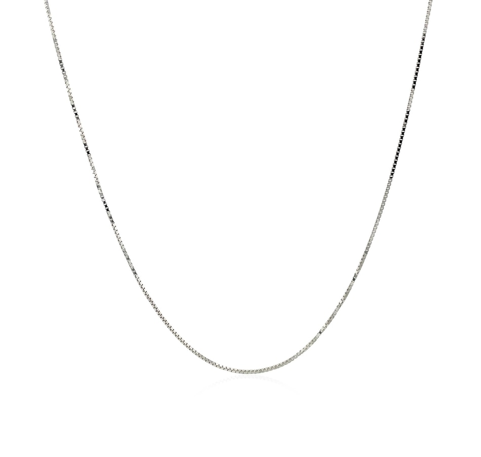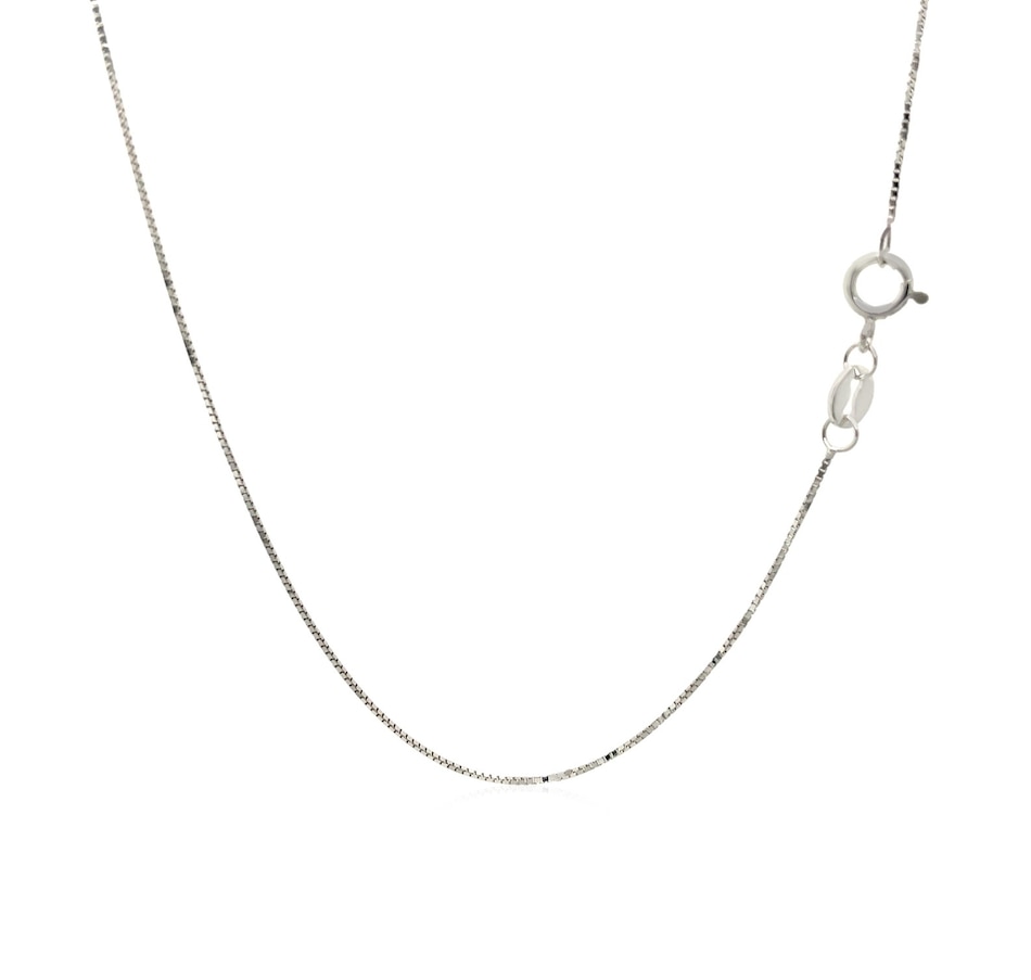 14k white gold, this adjustable box chain measures a width of 0.6 millimeters. The 18 inches can also wear as a 16”, and the 20 inches can also wear as an 18 inches chain secured with a spring ring clasp.
