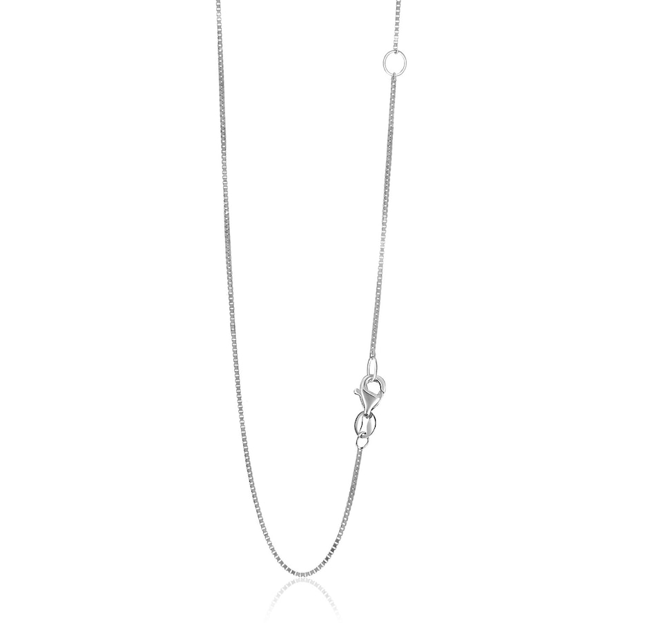 14k white gold, this adjustable box chain measures a width of 0.8 millimeters. The 18 inches can also wear as a 16 inches and the 20 inches can also wear as an 18 inches. The chain secured with a lobster clasp.