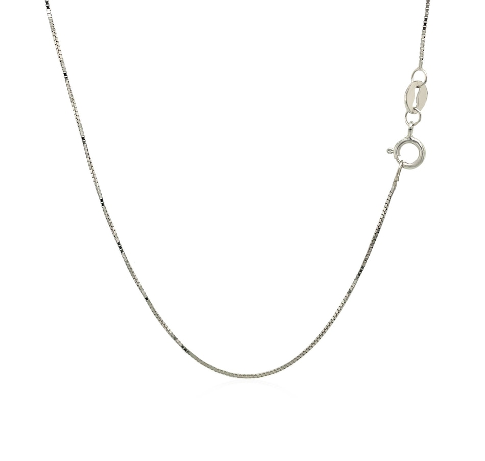 This classic box chain comes in 14k white gold and has a width of 0.6 millimeters.