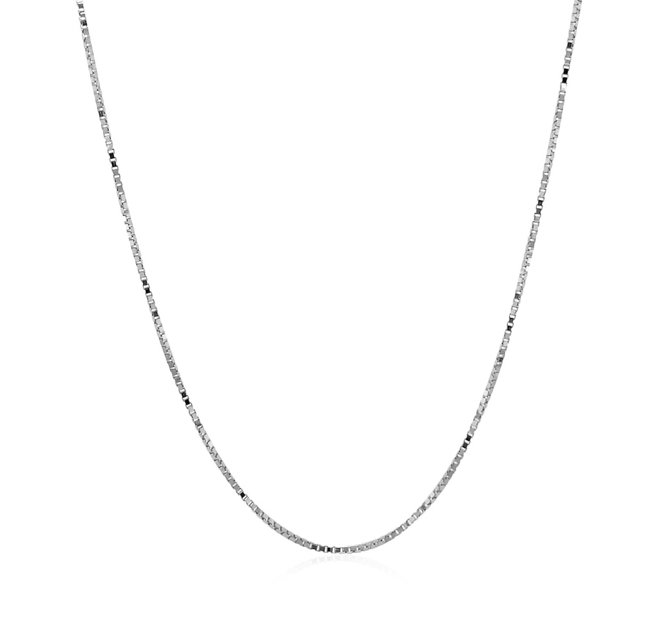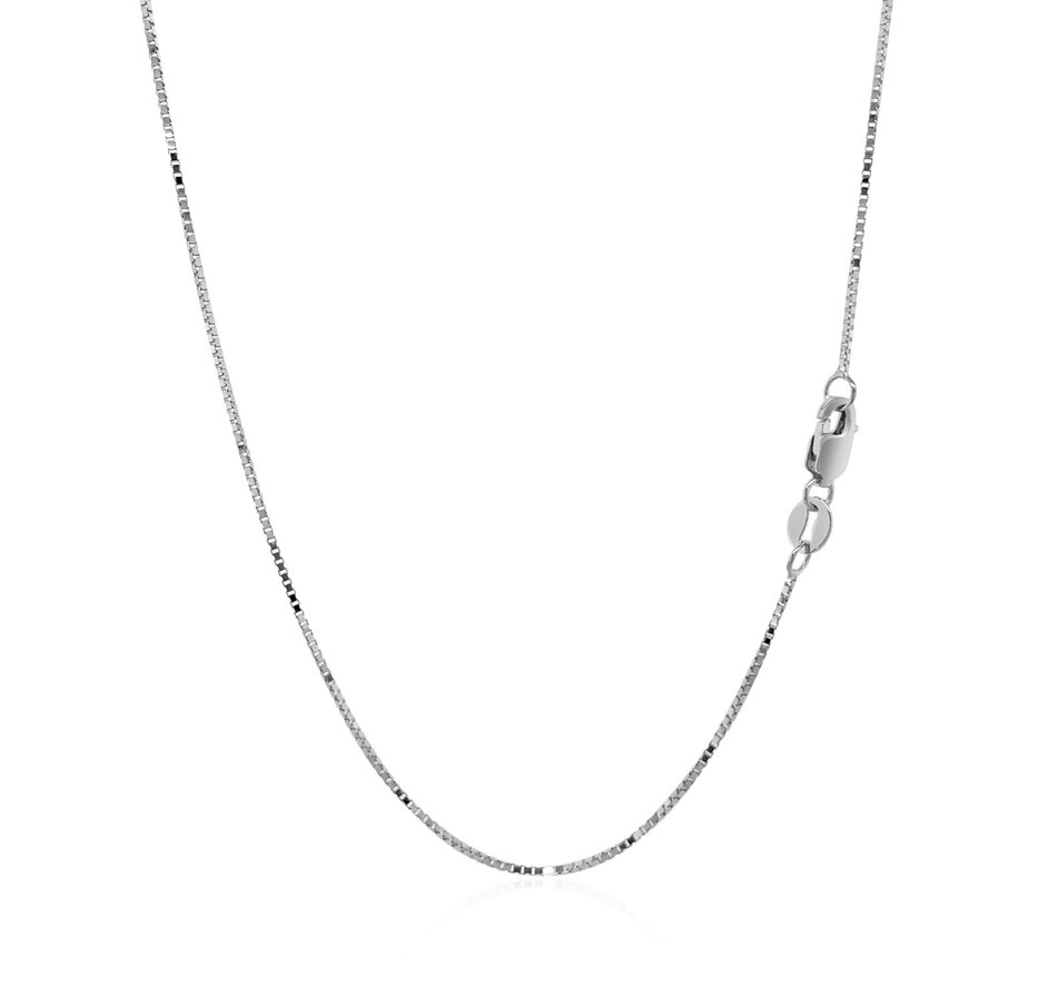 This classic box chain comes in 14k white gold and has a width of 0.7 millimeters.
