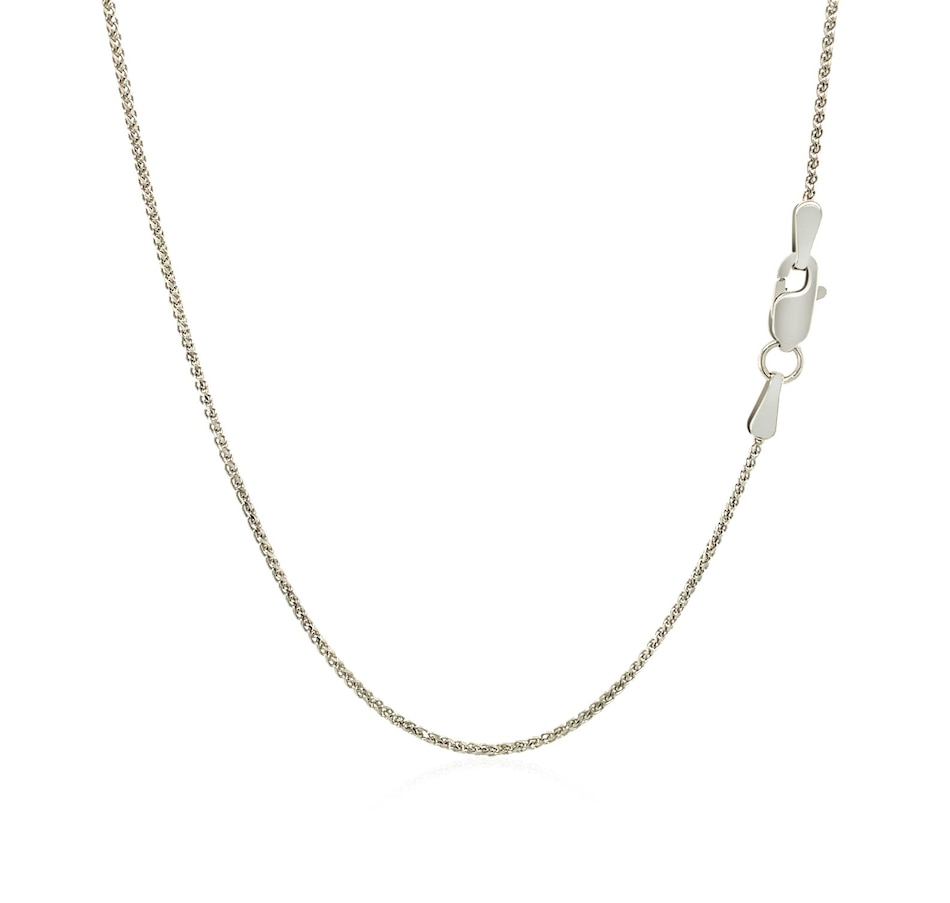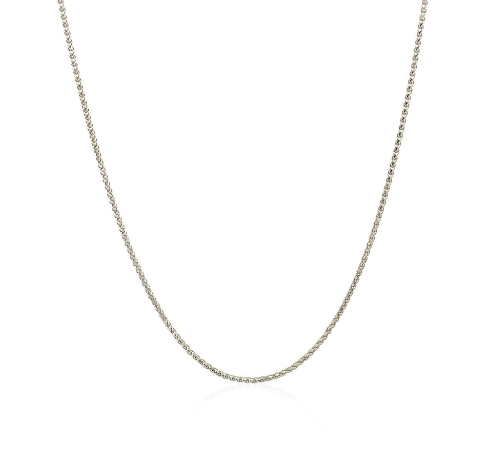This diamond cut round wheat chain comes in 14k white gold and has a width of 1.0 millimeters.