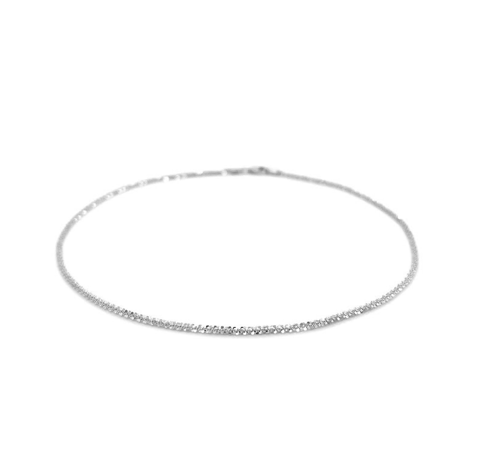 14k white gold, this sparkle anklet had a width of 1.5 millimeters and secured with a lobster clasp.