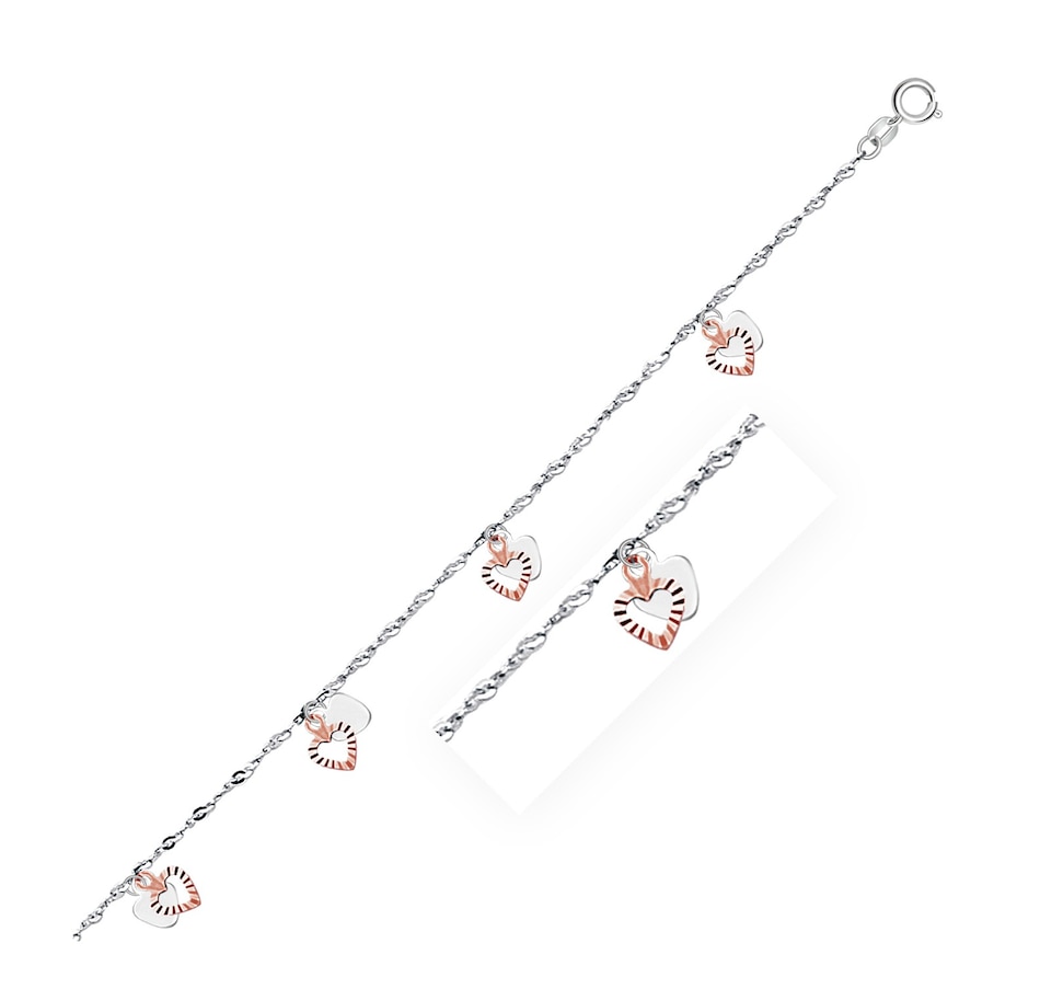 Dual heart style charms in open diamond cut and plain and polished motif highlight the sweet look of this chain anklet. Crafted in 14k rose and white gold, this 10 Inches anklet comes with a spring ring lock.