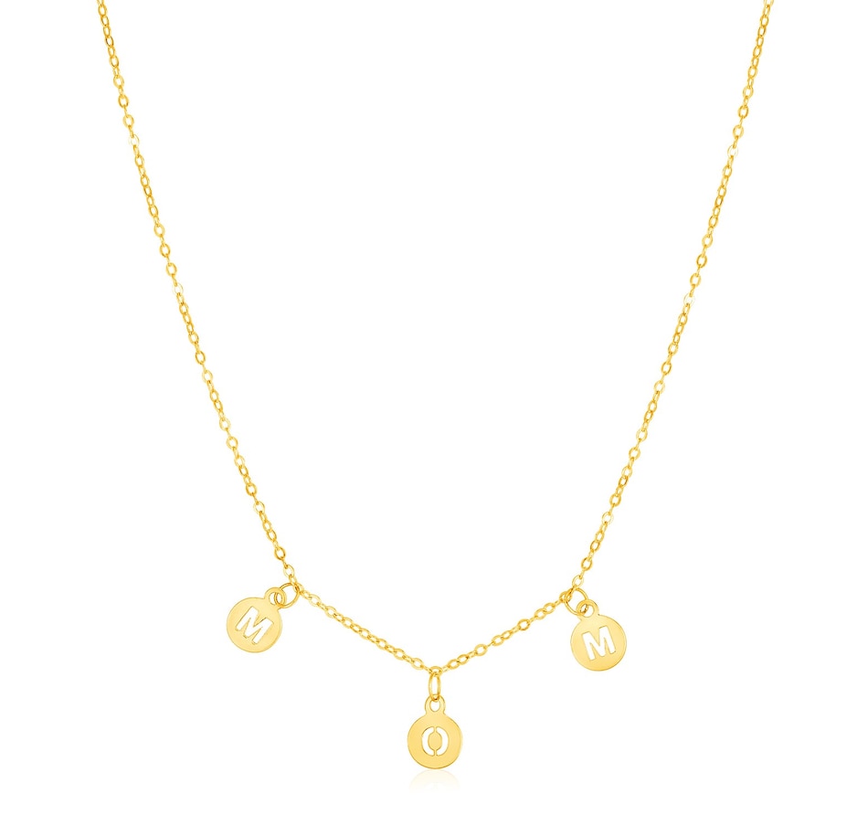 Wear motherhood with pride and love with this exquisite 14k yellow gold necklace, featuring sweet circle drops that spell "Mom". Necklace is 18 inches long.