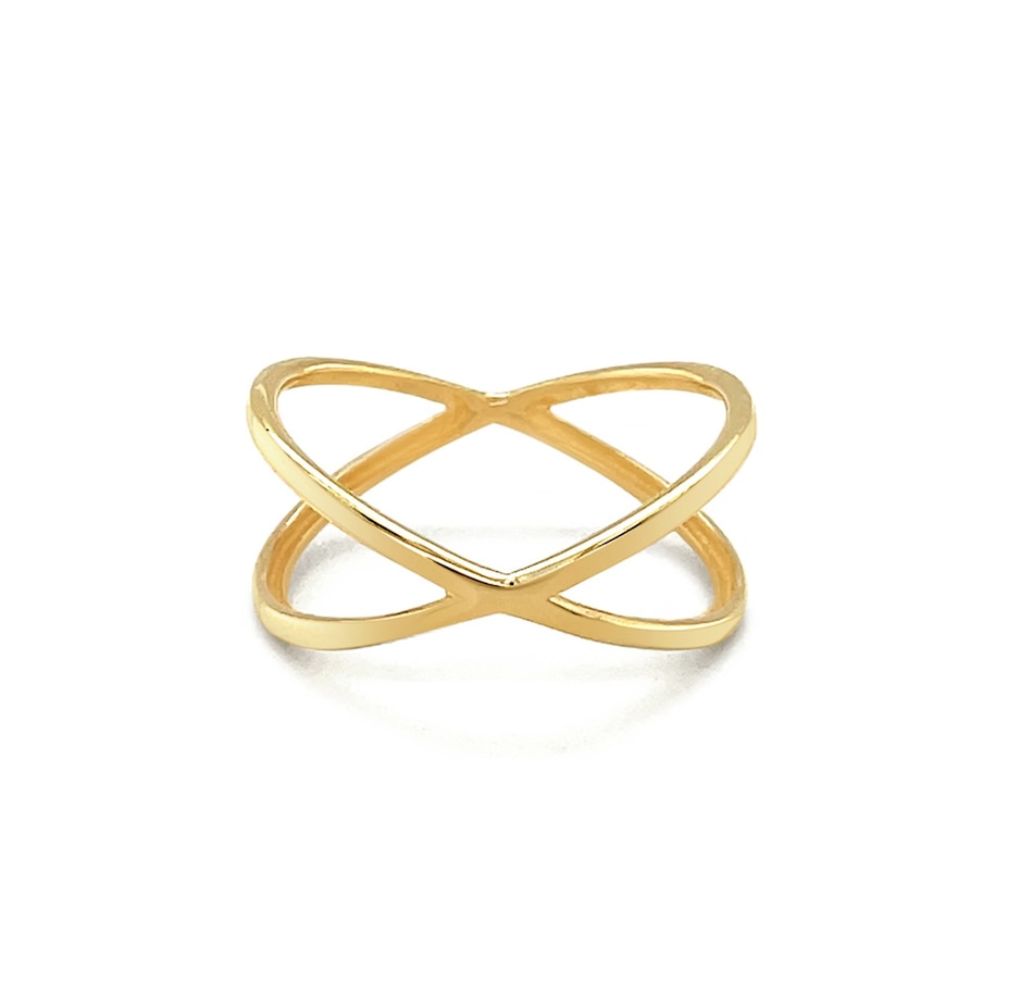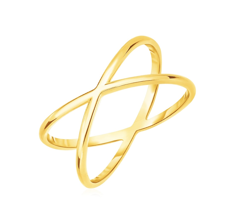 This elegantly polished 14k yellow gold ring features a modern "X" shaped profile. Ring sizes 7 and 8.