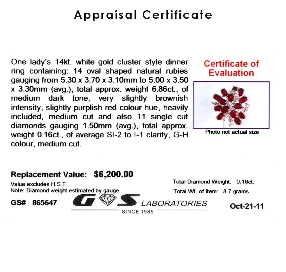 • Specs: (11) round shaped diamonds (.16ct), (14) oval shaped rubies (6.86ct)