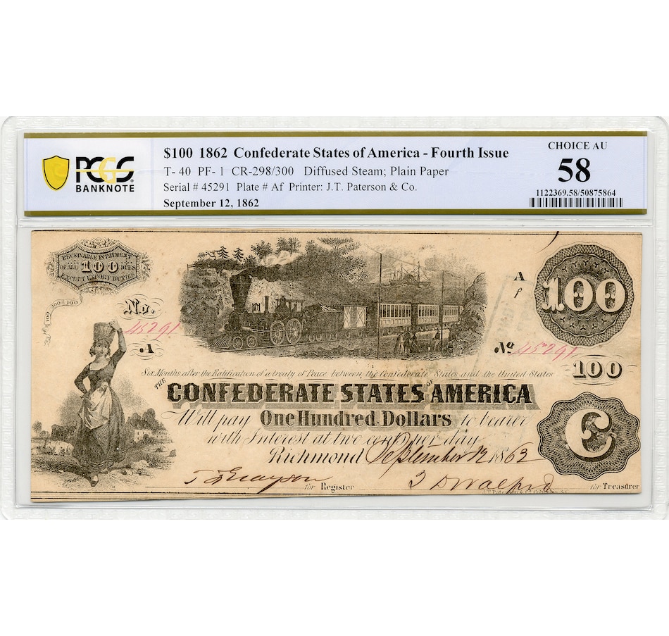This about uncirculated $100 Confederate note dates from 1862 and is a high-quality collectable from one of the most turbulent times in American history. It is authenticated and certified by independent third-party grading service PCGS Banknote as Choice About Uncirculated 58.