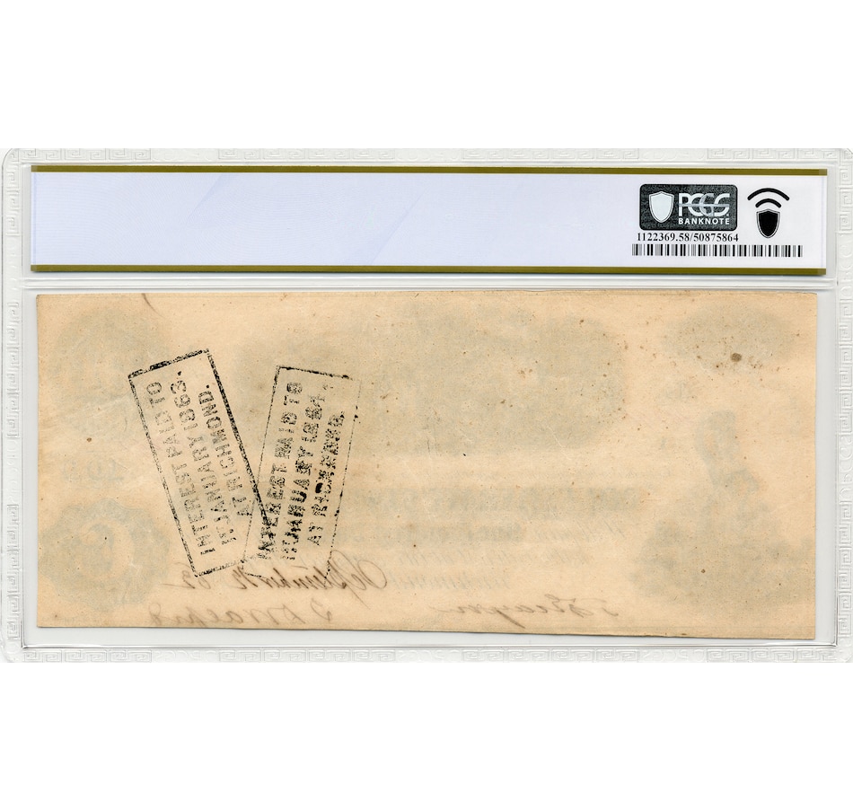 The inscription on the banknote reads: "Six months after ratification of a treaty of peace between the Confederate States and the United States/The Confederate States of America will pay one hundred dollars to bearer with interest at two cents per day receivable in payment of all dues except export duties." Interest was paid annually, and interest was in fact paid on most notes, as indicated by stampings on the back.