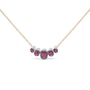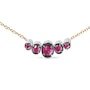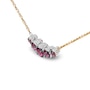 Set in luxurious 18k rose gold, this chocker necklace features a contemporary design of natural round heat-treated red rubies in a 4mm, 3mm, 2mm graduated sizing with the largest at the center, extending out to the smallest on a curved bar. Surrounding these prong-set natural gemstones on the sides are gorgeous round diamonds that sparkle from pave settings, ensuring the piece dazzles from every angle. These diamonds total 3/4 cttw with an approximate G-H Color and SI1-SI2 Clarity. The cable chain is adjustable up to 14" - 16.5" to complement the neckline as you see fit and it secures around the neck with a lobster claw clasp.