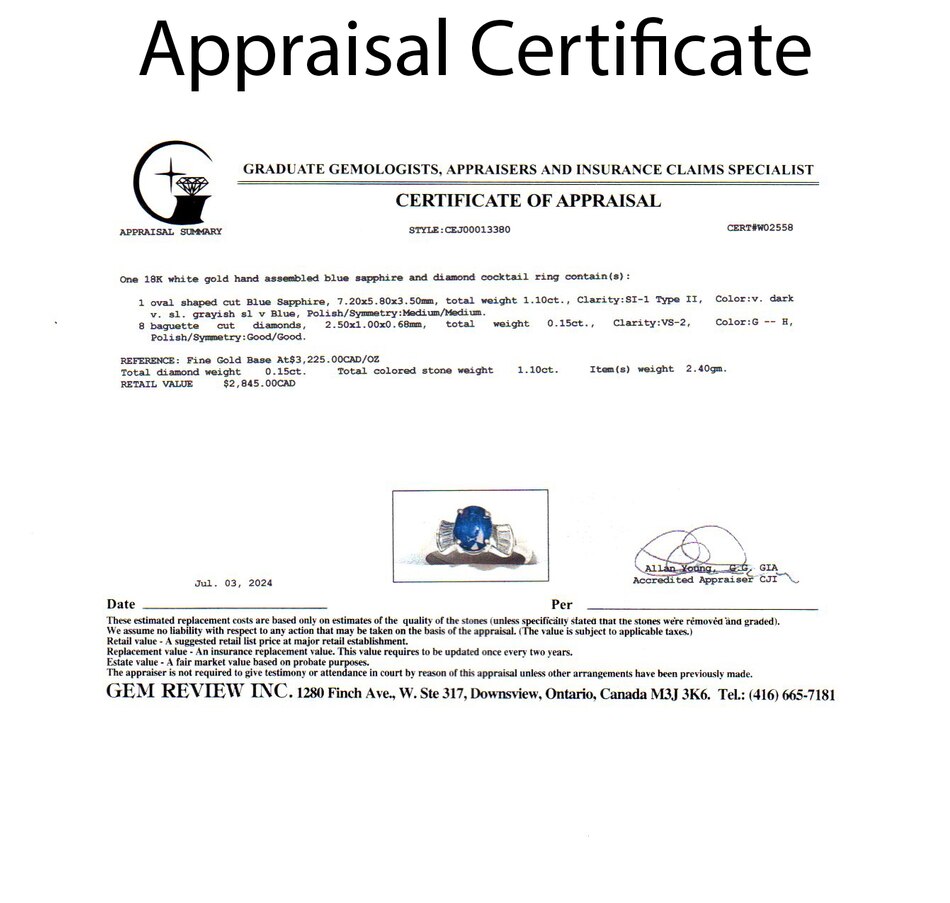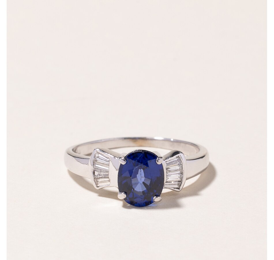 • (1) oval shaped sapphire (1.10 av. ctw), (8) baguette cut diamonds (0.15 av. ctw)