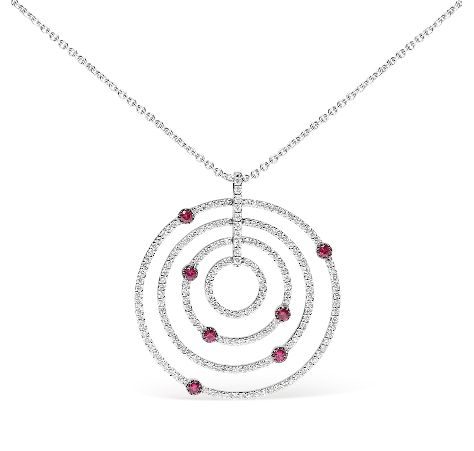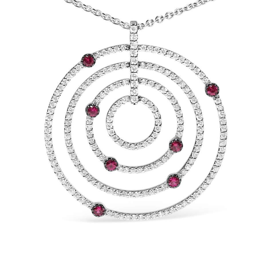 This statement pendant necklace showcases multiple rows of sparkling round diamonds pave-set in concentric openwork circles cast in 18k white gold. These diamonds shimmer and shine in a total 2 1/6 cttw with an approximate G-H Color and SI2-I1 Clarity. Natural 2.8mm round heat-treated red rubies accent this look, studded in random positioning within their prong settings. This attention-grabbing pendant suspends from an 18" cable chain that fastens with a lobster claw clasp. Adjustable up to 16" - 18"