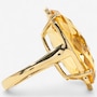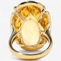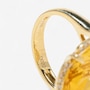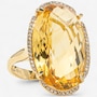 Radiant and refined, this beautiful yellow gold ring showcases a breathtaking 22.86-carat oval-shaped citrine, checkerboard-cut to maximize its brilliance and lively golden hue. The gemstone’s distinctive faceting catches and reflects light with every movement, creating a dazzling display of warmth and depth. Held securely by four thoughtfully placed prongs, positioned at the sides toward the top and bottom, the citrine is framed by elegant curved segments of gold, each set with sparkling round brilliant cut diamonds. The top and bottom segments are each adorned with 11 diamonds, while the longer sides shimmer with 15 diamonds apiece, creating a total halo of 52 fine diamond accents that enhance the richness of the central stone.