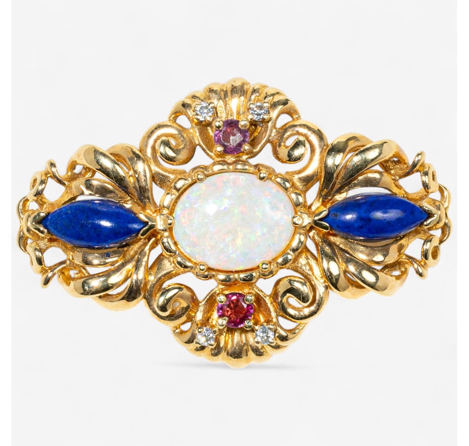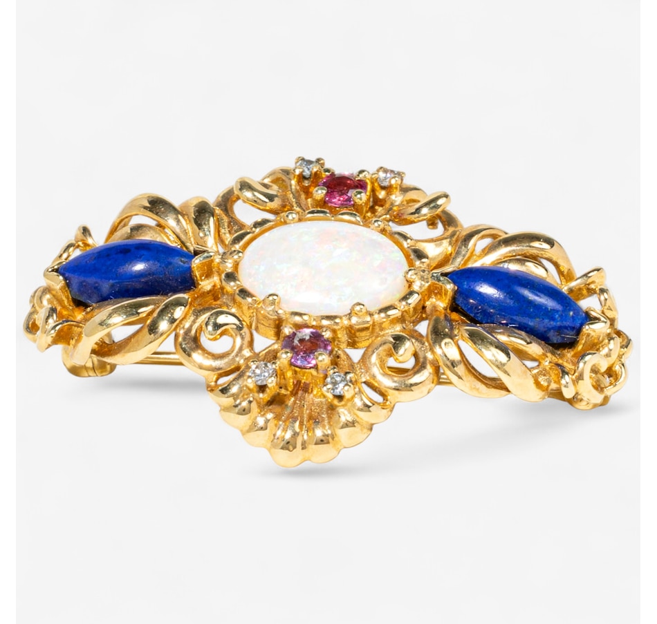 18K Yellow Gold Opal, Lapis Lazuli, Pink Sapphire and Diamond Brooch