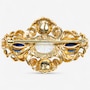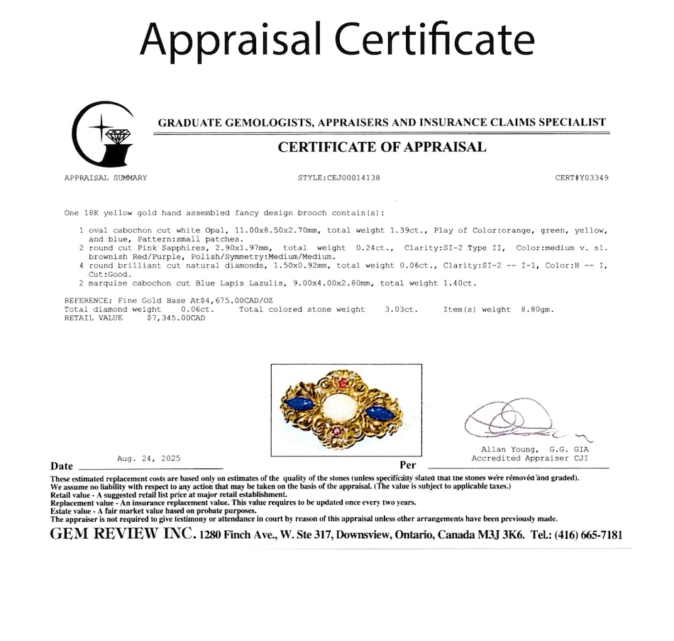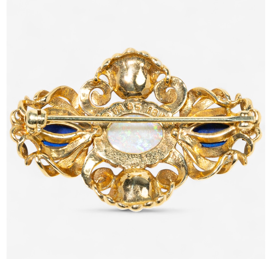 Steeped in ornate artistry and historical elegance, this yellow gold brooch is a masterful example of Byzantine-inspired design, rich with texture, colour, and symbolism. At its heart lies a glowing oval cabochon cut opal, bezel-set horizontally within a delicate scalloped frame, evoking the soft iridescence and ethereal quality so characteristic of the opal’s shifting play-of-colour. Extending along the horizontal axis of the piece are two marquise-shaped cabochon cut lapis lazuli gemstones, one on each side of the central opal.