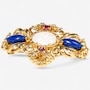 Their deep, velvety blue hue adds a regal contrast to the opal's soft luminescence, anchoring the design with bold, ancient richness. Above and below the central opal sit two vibrant prong-set pink sapphires, each flanked by a pair of brilliant-cut white diamonds, bringing a balanced sparkle and vibrant colour contrast to the overall palette. These gemstone placements echo the symmetrical refinement typical of Byzantine jewellery, where sacred geometry and intricate ornamentation harmonize in meaningful beauty. The gold framework of the brooch is adorned with scroll and ribbon-like pierced work, finely detailed to create an open, airy feel while adding dimension and depth.