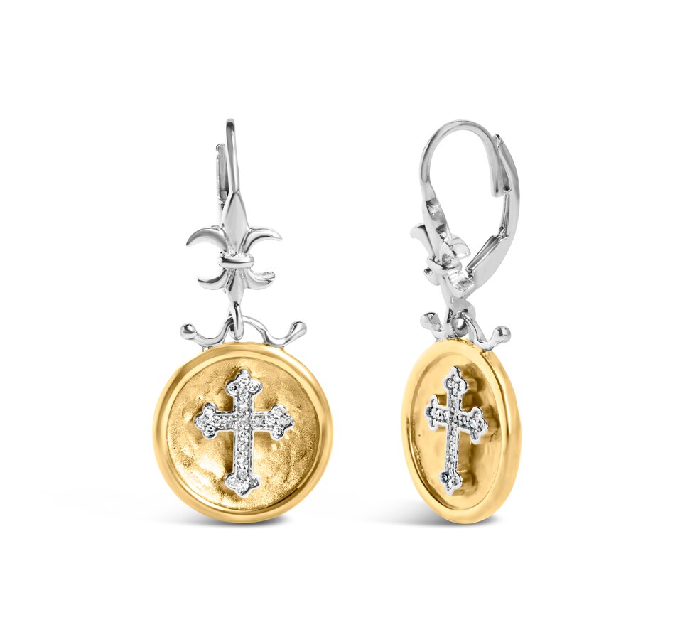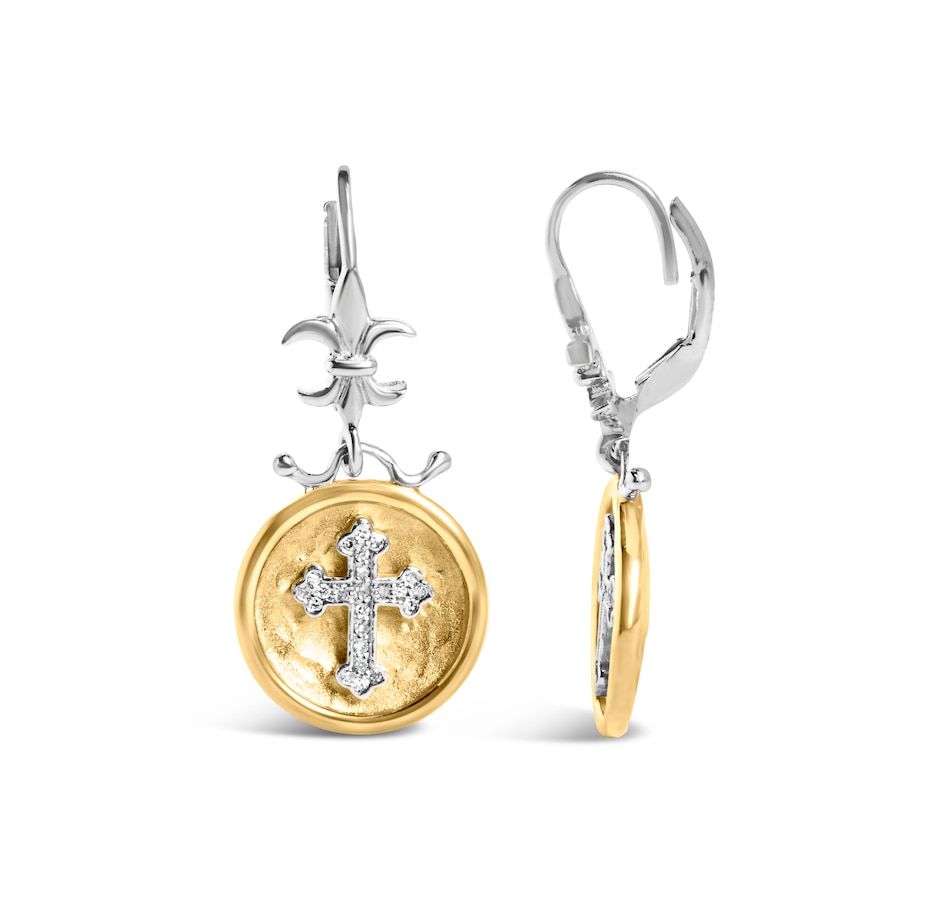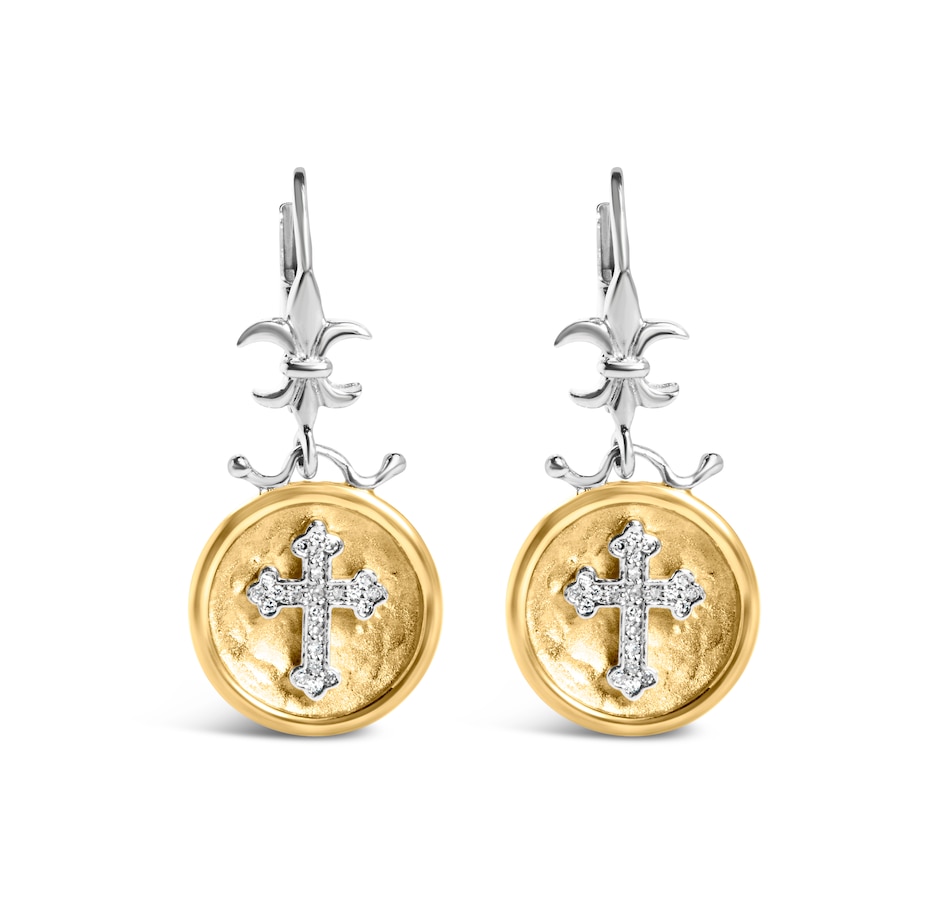 Step into elegance with our exquisite 18K Yellow Gold Plated .925 Sterling Silver Diamond Hammered Finished Medallion with Cross Drop and Dangle Earrings. Crafted to perfection, these earrings feature a stunning total of 46 natural round diamonds with a total weight of 1/8 cttw, showcasing a mesmerizing play of light in I-J color and SI1-SI2 clarity. The intricate micro-pave setting enhances the brilliance of each diamond, creating a captivating sparkle that will leave you spellbound. The hammered finish adds a touch of texture and uniqueness to the medallion and cross design, making these earrings a symbol of timeless beauty and faith. Complete with secure lever-back findings, these earrings offer both style and comfort, making them an irresistible choice for any woman looking to elevate her ensemble with sophistication and grace.