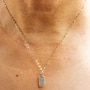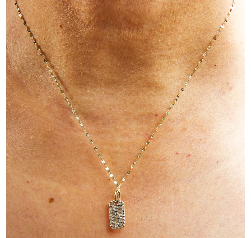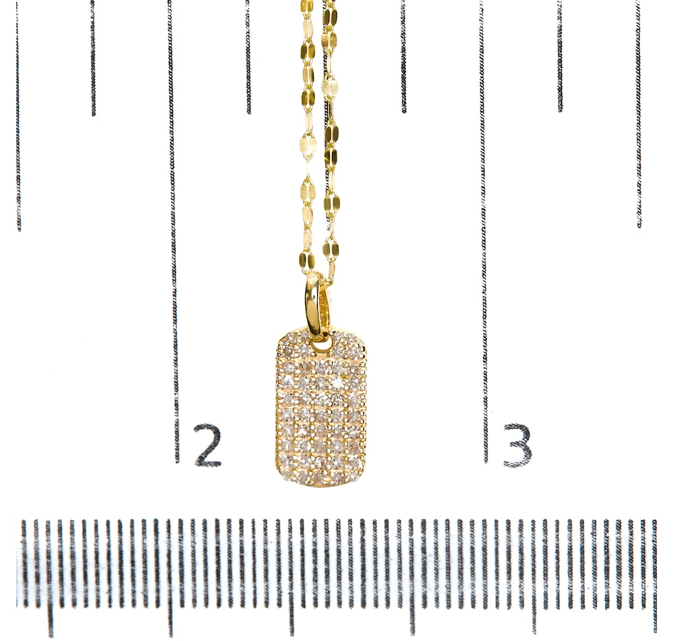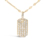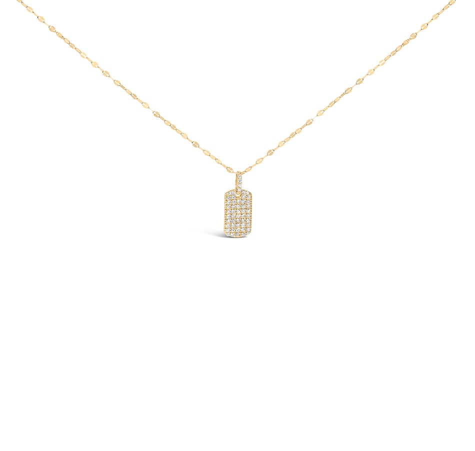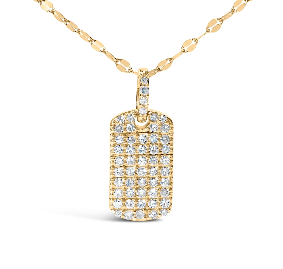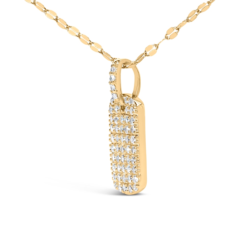 Discover the captivating allure of the 18K Yellow Gold Plated .925 Sterling Silver Diamond Studded Dog Tag Pendant Necklace, a luxurious meld of craftsmanship and style. Each shimmering diamond, naturally sourced, is meticulously placed on the polished, golden surface of the prestigious dog tag to create a seamless blanket of radiance. Boasting I-J color and I2-I3 clarity, these enchanting gems ensure a sparkling presence that captures the eye. The pendant gently dangles from an elegant 18-inch lumachina chain, whose fine links glimmer subtly with every movement, secured by a robust lobster clasp. This exquisite piece not only embodies a bold aesthetic but also evokes a sense of enduring sentiment, making it a perfect keepsake or a heartfelt gift. Indulge in the refined beauty of this necklace, a symbol of luxury that complements both the bustling daytime engagements and the enchanting evening escapades.