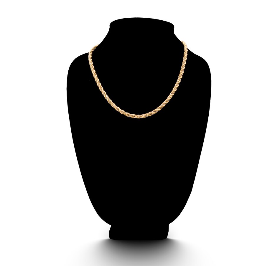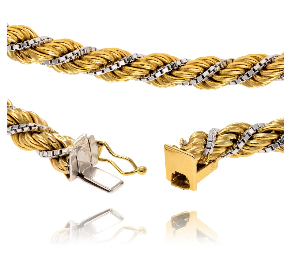 This classically designed chain is crafted in gold. It features a wide yellow gold rope chain that is intertwined with a smaller white gold box link chain that is secured in the twist so that it won't unravel. A hidden box clasp and safety latch caps the ends.