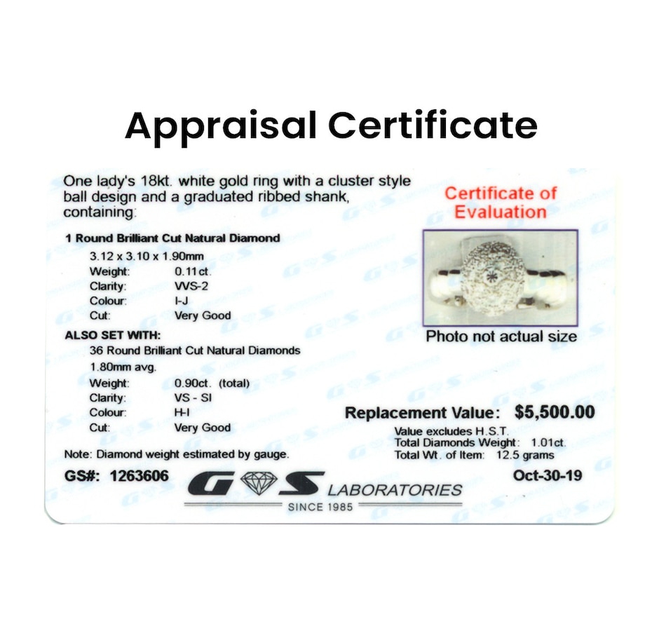 Specs: (1) round brilliant cut diamonds (.11ct), (36) round brilliant cut diamonds (.90ct), 1.01ctw