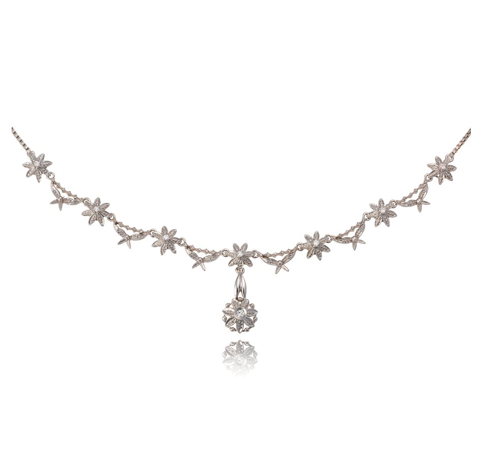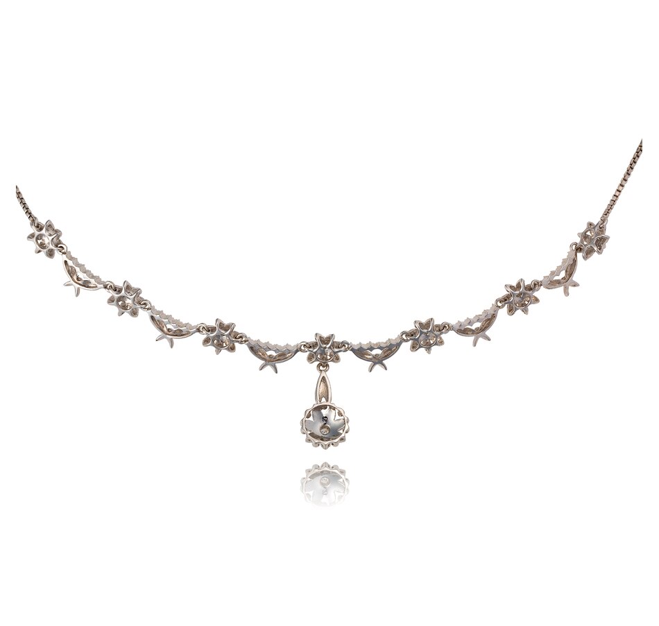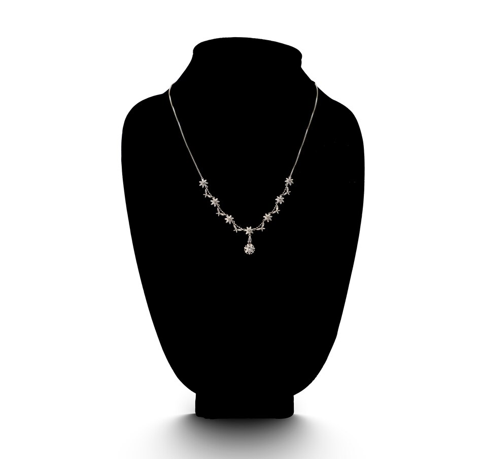 This vintage diamond necklace is crafted in beautiful white gold and features a floral centerpiece attached to a box and cable link chain with a cylindrical clasp. Each side of the centerpiece displays three daisy-like flowers punctuated in the middle with a small diamond. Each of these flowers is separated from the next by a fancy bead and butterfly link. Each side culminates in another flower to which a drop larger floral link is attached.