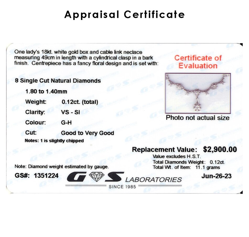 18KT White Gold Box and Cable Link Necklace with a Floral Diamond and Drop Centerpiece