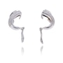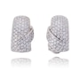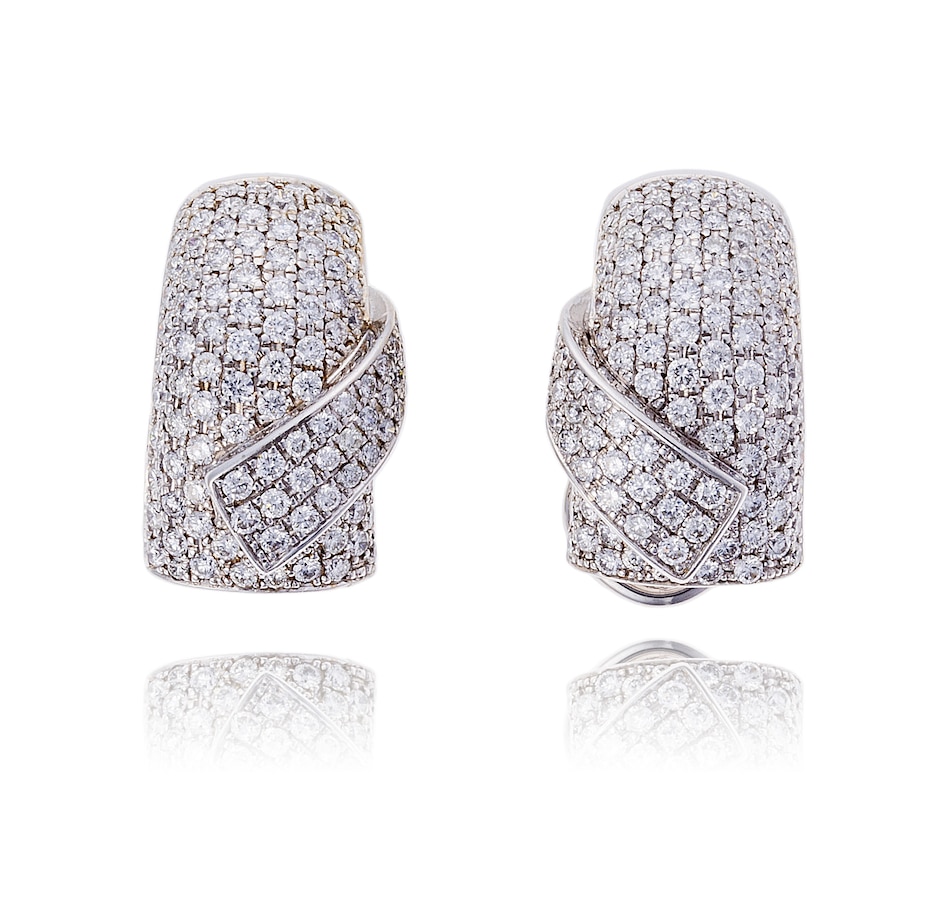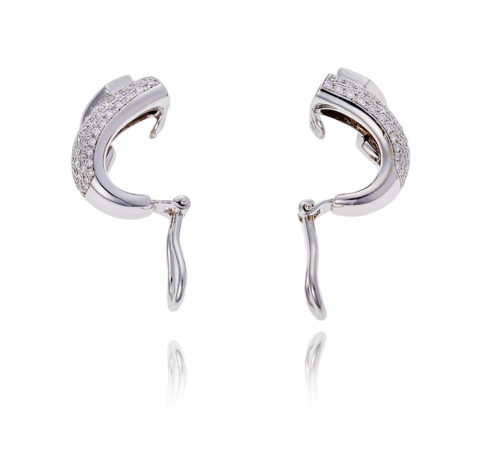These dazzling earrings are crafted in beautiful white gold. The design flairs at the top and tapers just slightly as it curves to include the omega back for non-pierced ears. A flap folds over to overlap the domed design and it is pave set with excellent quality diamonds.