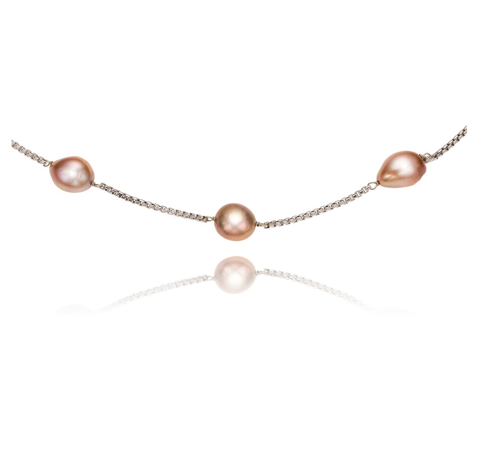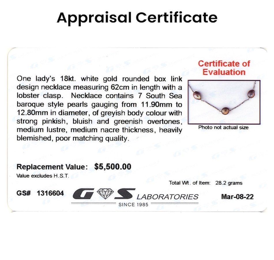 This outstanding station necklace features seven South Sea baroque style pearls, and each exhibiting a greyish body colour with strong pinkish, bluish and greenish overtones. Each pearl is evenly separated by 4 centimeters of 18kt white gold rounded box link chain which continues to the clasp.
