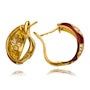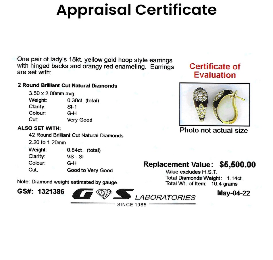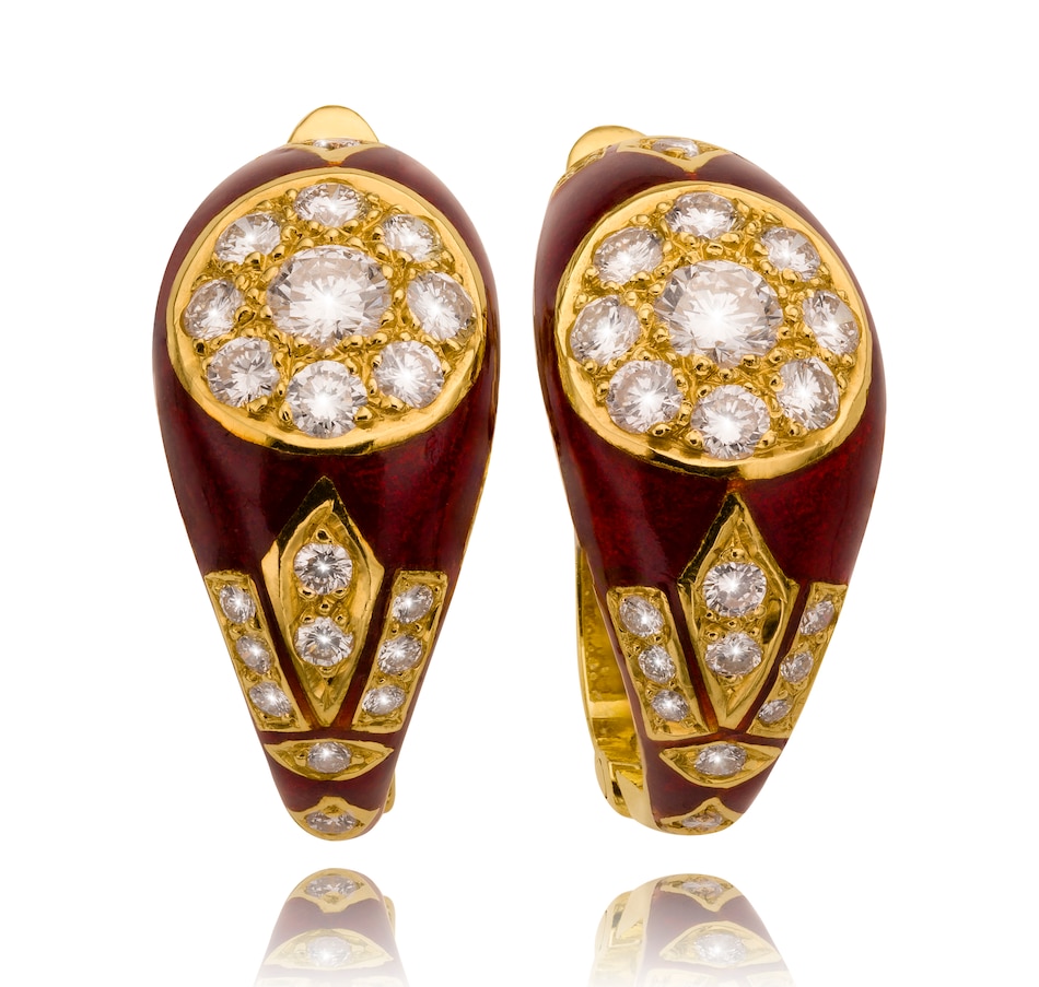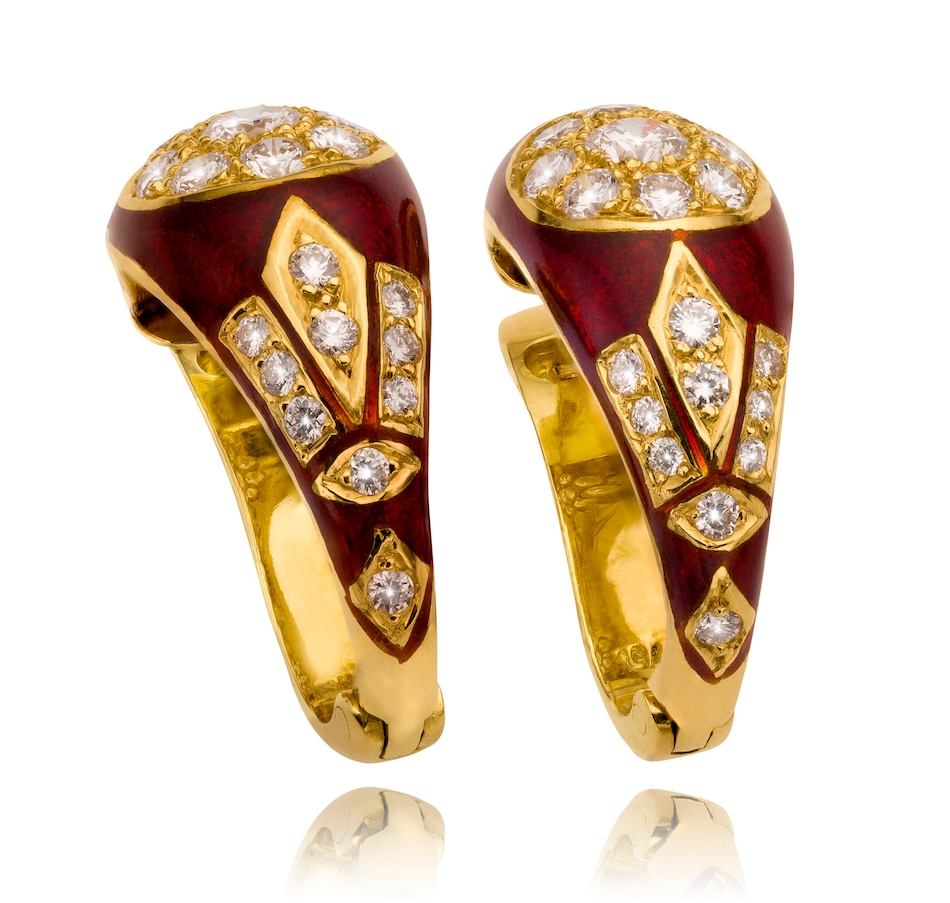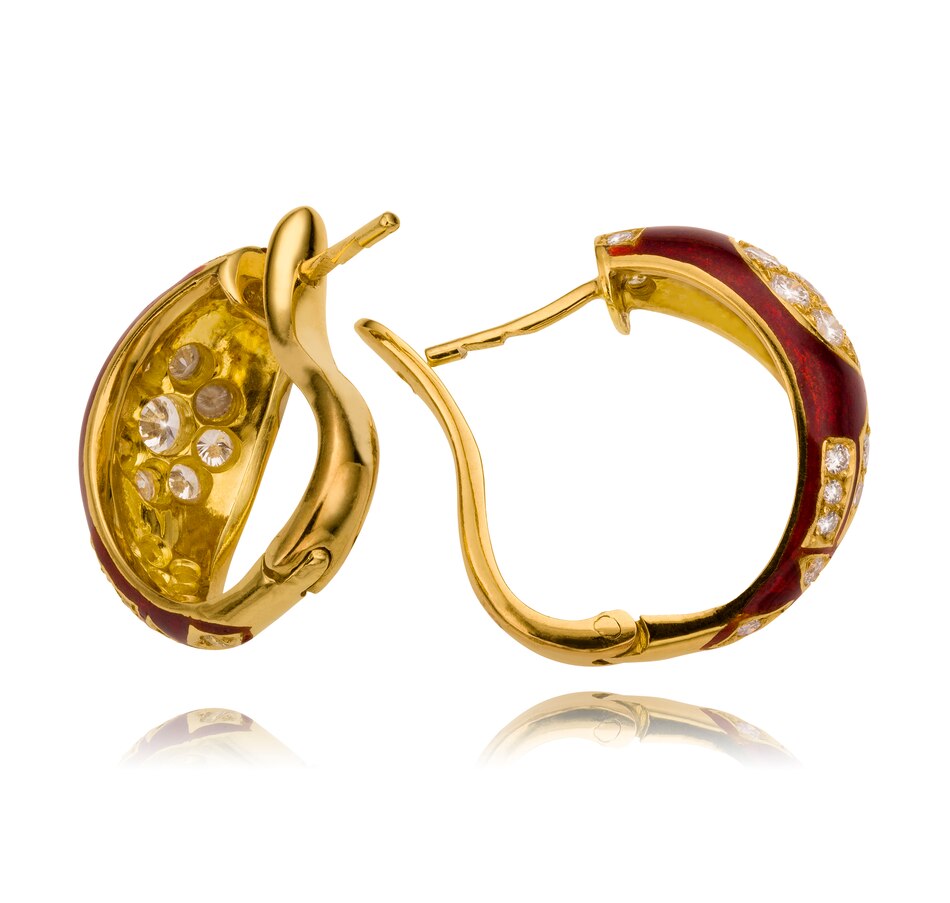18KT Yellow Gold Diamond-Set Red Enamel Hinged Back Hoop Earrings