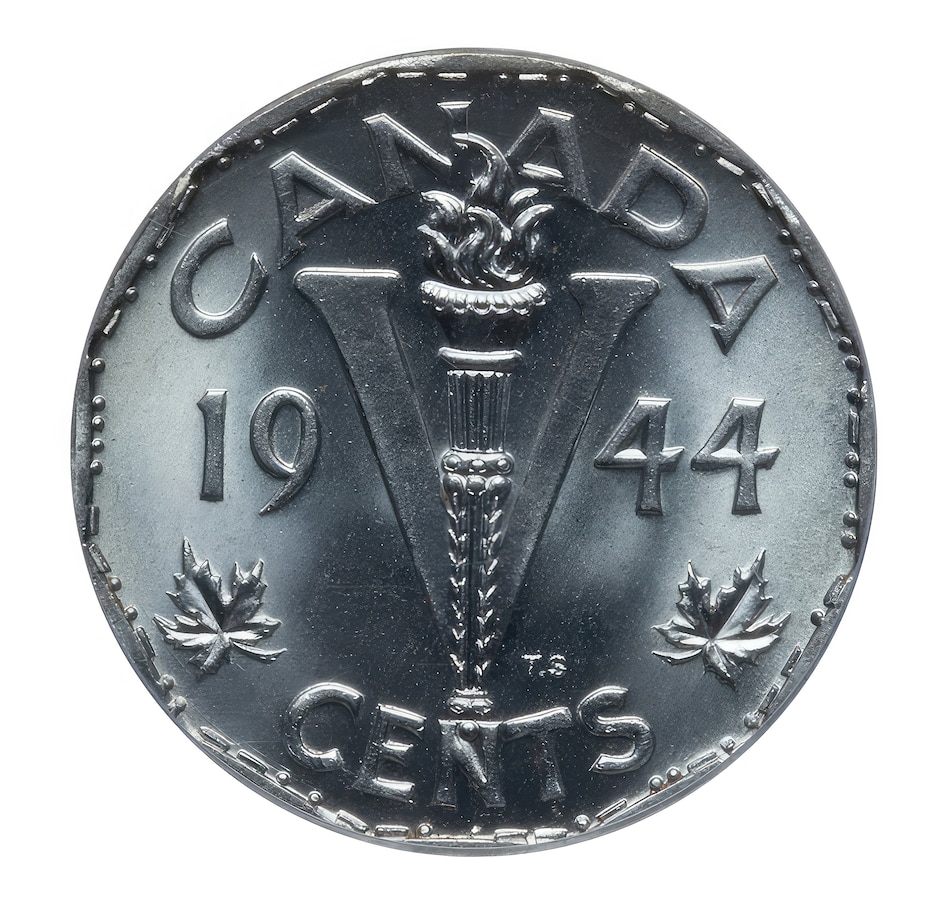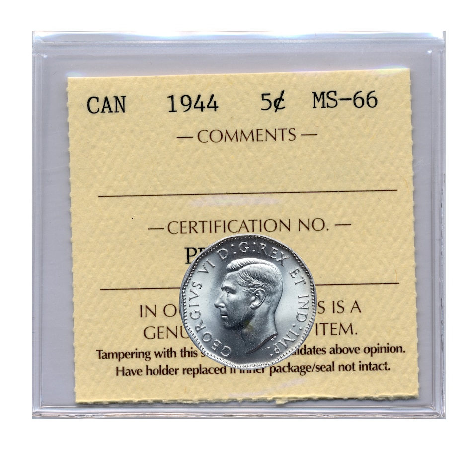 This is a near-perfect superb gem uncirculated example of Canada's 1944 victory war issue nickel. It's one of the best surviving examples and has been independently third-party certified as Mint State 66 by the International Coin Certification Service, Canada's most respected and trusted grading service. Only a very small percentage of coins from this era have survived in this exceptional condition, making it both visually appealing and extremely rare for collectors to acquire.