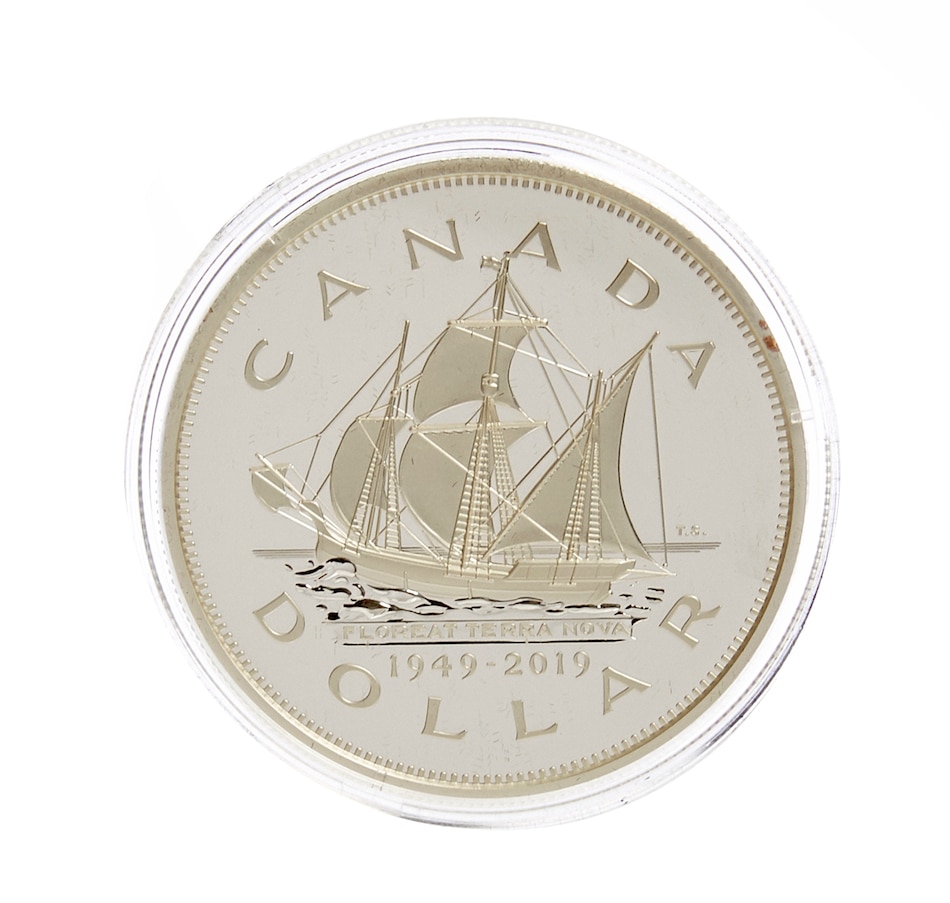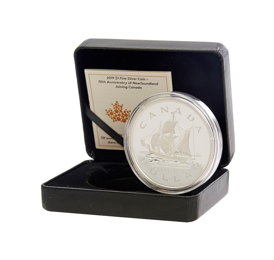 When Newfoundland joined Canadian Confederation in 1949, the event was celebrated with the release of Canada's third-ever commemorative dollar coin. Seventy years later, this classic design has been re-created by the Royal Canadian Mint in a large, five-ounce fine-silver format with a low mintage of just 1,000 coins.