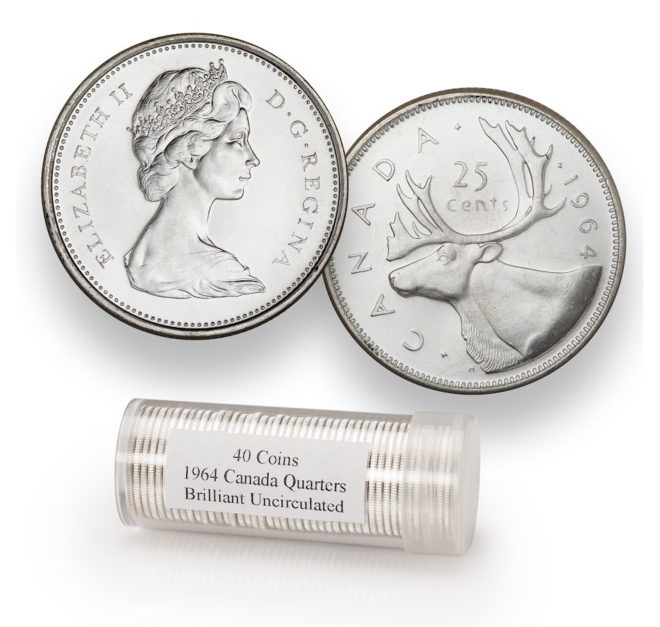Very few coins from more than 60 years ago have survived still in original brilliant uncirculated rolls as they were issued through Canada's chartered banks, and these scarce rolls often include some of the best premium-quality examples of uncirculated coins from this era. This is an original roll of 40 silver quarters issued in 1964, just as the coins were issued newly shipped from the Royal Canadian Mint. The coins are all made of .800 silver, with the roll containing six ounces of pure silver. While silver quarters from this era are not especially rare, original rolls are seldom encountered and exceptional quality uncirculated coins are scarce and highly sought-after.