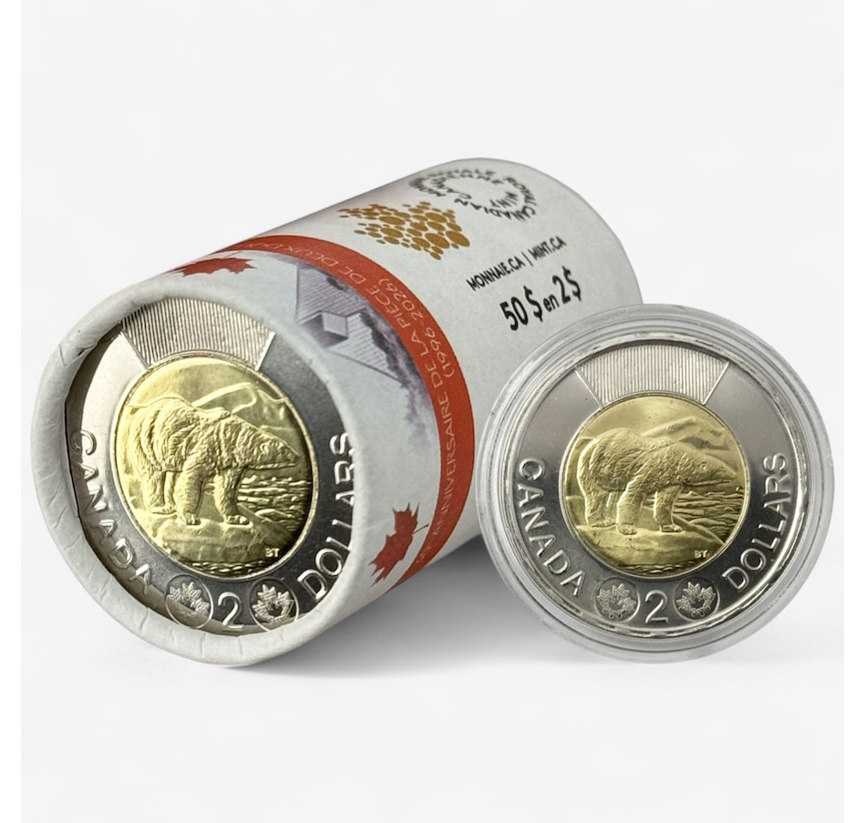 Mark a milestone in Canada's currency history with a special wrap roll of this 1996–2026 collector's edition two-dollar coin, a special collectible available only as a collector edition and not being issued for circulation. Each special wrap roll contains 25 brilliant uncirculated examples of the double-dated design, each of which is further distinguished by a "W" mint mark from the Winnipeg Royal Canadian Mint facility—the place that has produced the Toonie since the coin denomination's debut in 1996.