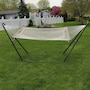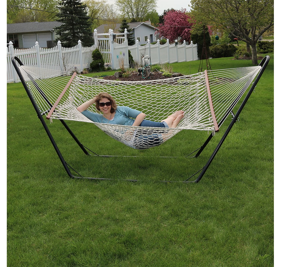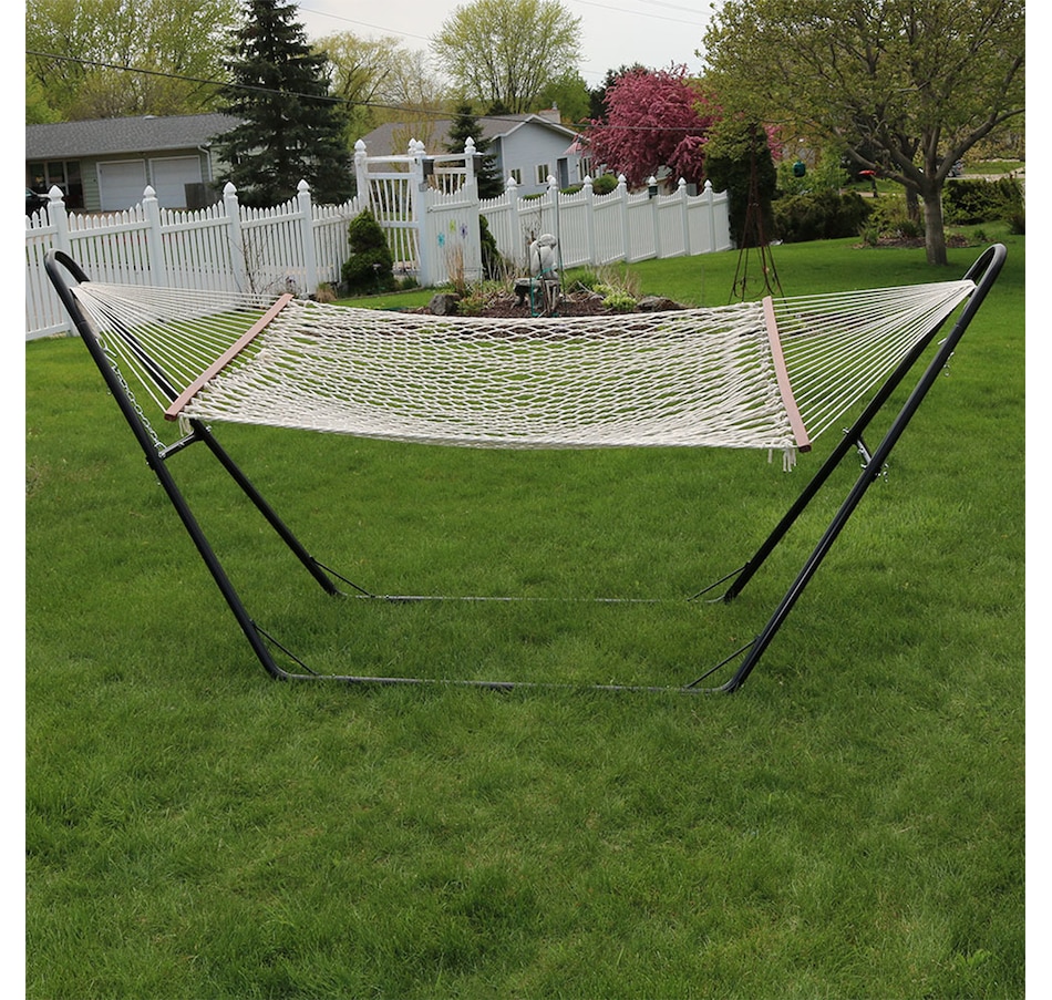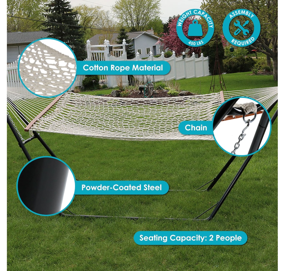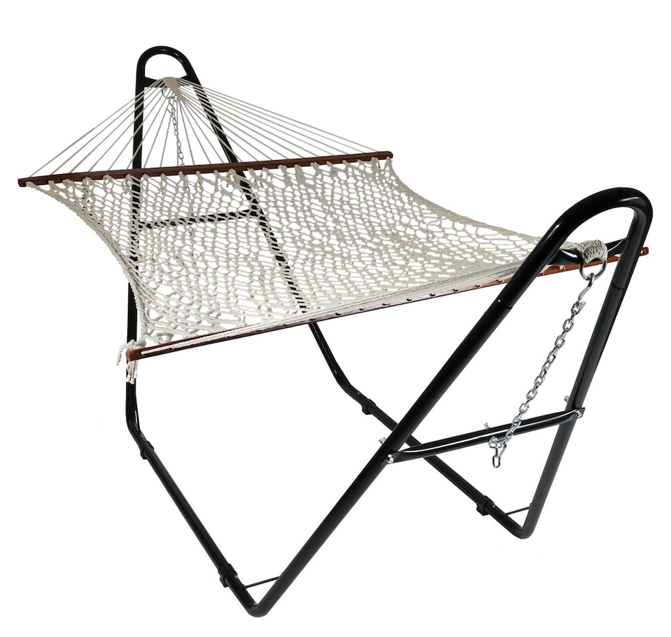 Sure to add traditional charm, this cotton, 2-person rope hammock with wooden spreader bars and a steel stand will provide comfort and style to any outdoor space. The hammock features durable cotton rope materials and hardwood spreader bars as well as metal O-rings for hanging. The included multi-use hammock stand features a versatile A-frame design and a durable powder-coated steel construction. Both the woven cotton and steel stand provide comfort and durability against most weather conditions. In addition to fitting the quilted hammock in this set, the stand is suitable for other hammock styles as well including Brazilian hammocks, Mayan hammocks, and other spreader bar hammocks that are 9' to 14' long. Place this hammock and stand set on the patio or deck for easy access to the indoors, or place under a beautiful tree canopy in the yard to enhance any relaxation experience.