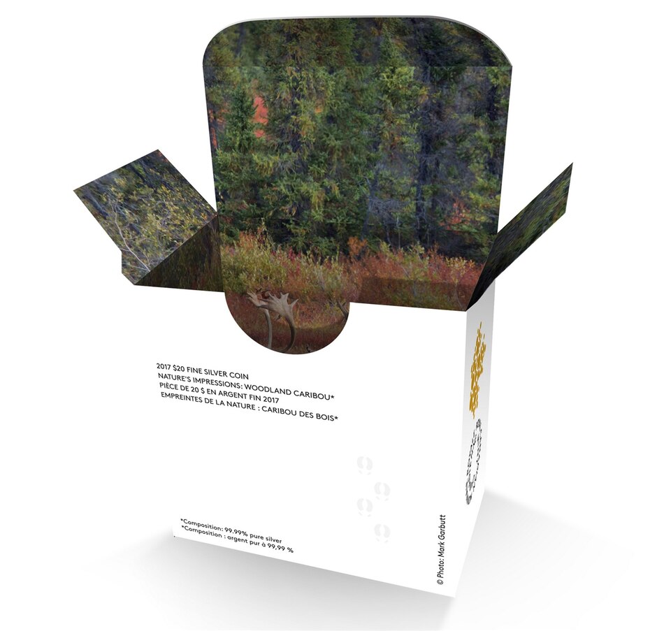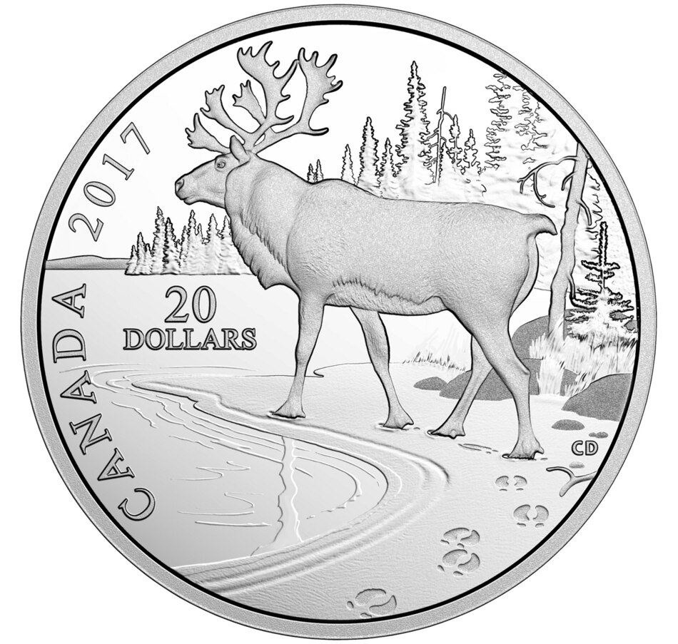 Walking in the footsteps of the woodland caribou allows for a glimpse of Canada's unspoiled natural beauty—a vast landscape and a rugged wilderness that seems untouched by time. This 2017 $20 one-ounce fine silver coin celebrates a beloved Canadian species and a national icon that is at home in the remote areas of Canada's expansive boreal forest.