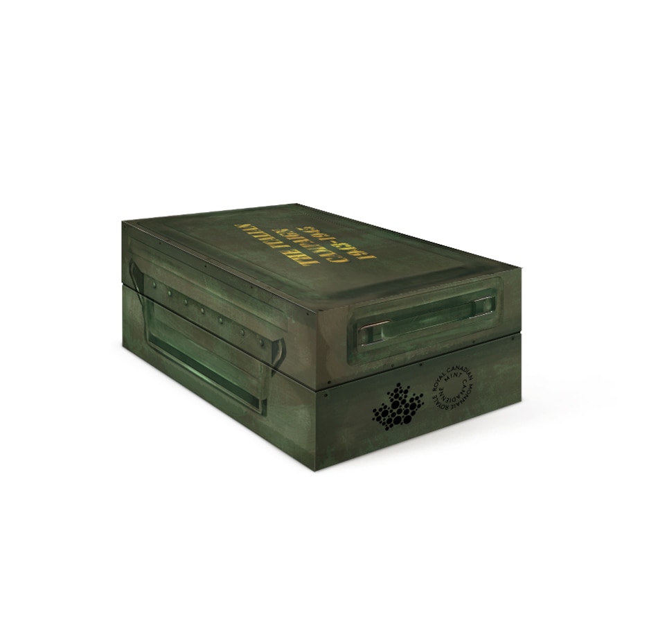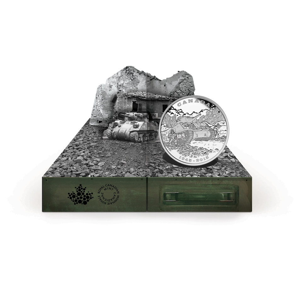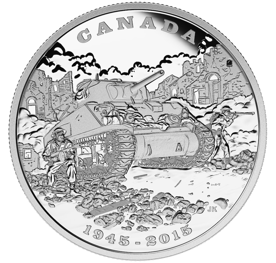 Designed by Canadian illustrator Joel Kimmel, this coin recreates the sense of danger and the fierce fighting that awaited Canadian soldiers in the narrow streets of Italian towns such as Ortona during the winter of 1943. In the background, the crumbling remnants of stone buildings are indicative of the sheer destruction caused by combat that was often fought in close quarters. In the centre, a Canadian Sherman tank rumbles through the rubble-filled streets, causing dust to fill the air behind it. The tank is flanked by two Canadian soldiers who, despite the risk of sniper fire and landmines, bravely move along the streets as they clear the town and search for survivors. The coin is engraved with the word "Canada" and the double date "1945–2015" on the reverse, and features the of the effigy of King George VI on the obverse.