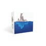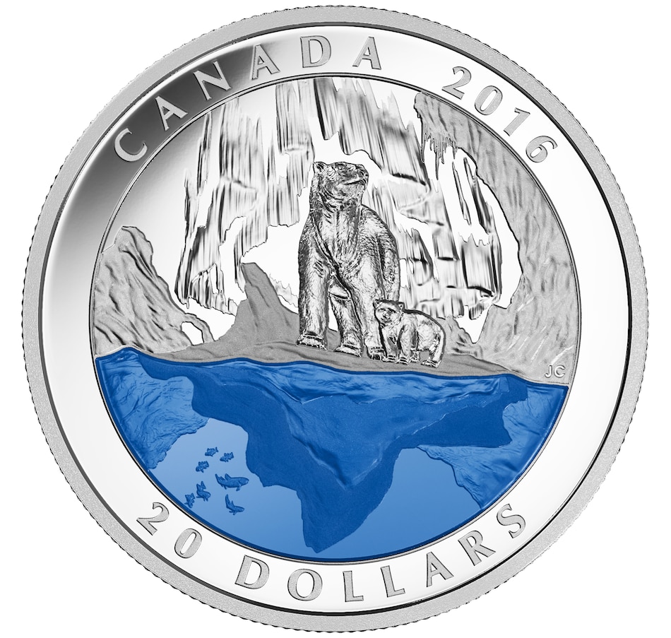 The reverse design by Canadian artist Julius Csotonyi centres on a portrait of a mother polar bear and her tiny cub. The cub leans in against the mother's right front leg, looking directly at the viewer as the mother gazes toward the right side of the image. The two bears stand on a small iceberg, floating amid other larger bergs in open water. Above them, the aurora borealis illuminates a starlit sky. The bottom half of the image presents the underwater view of this scene, with a school of Arctic cod swimming near the submerged section of the polar bears' iceberg. The underwater portion of the image is overlaid with translucent blue enamel, lending depth and colour to the coin's highly detailed engraving and shading. A polished outer band bears the word "Canada," the date "2016," and the face value of "20 dollars." The obverse features the effigy of Her Majesty Queen Elizabeth II by Susanna Blunt.
