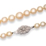 This mid-length 20" matinee strand of cultured pearls features sixty-one off-round pearls that graduate in size as they flow toward the front. Each of the pearls are individually knotted and presents a yellow body colour with pinkish and greenish overtones. A fancy filigree and granulated white gold vintage floral clasp with rose-cut diamonds is attached.