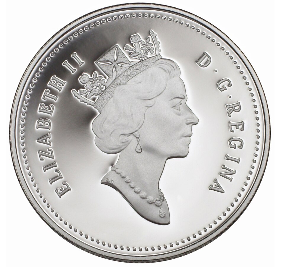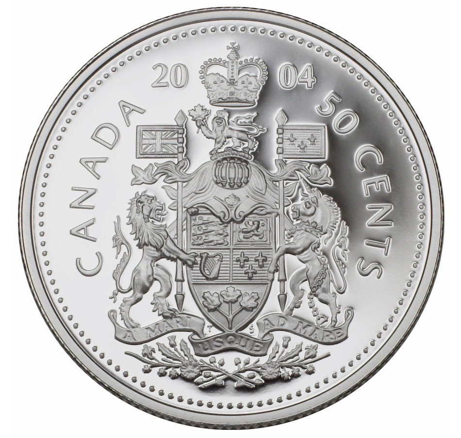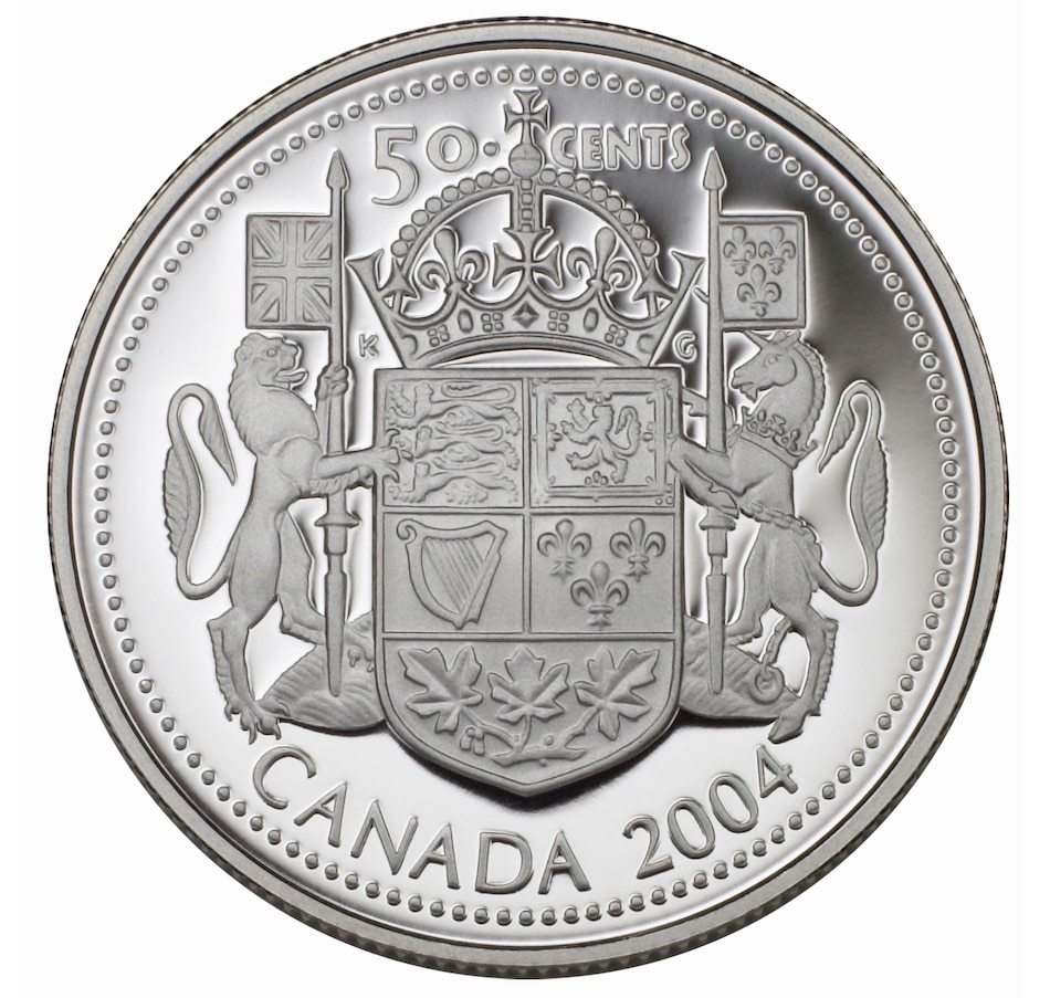The four coins in the 2004 50-cent sterling silver coin set retrace the effigies of Her Majesty Queen Elizabeth II that have appeared on the 50-cent coin during the past 51 years. The coat of arms that appears on the reverse of each coin reflects the design that was in use when each new effigy was introduced.