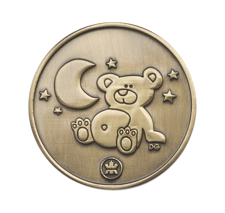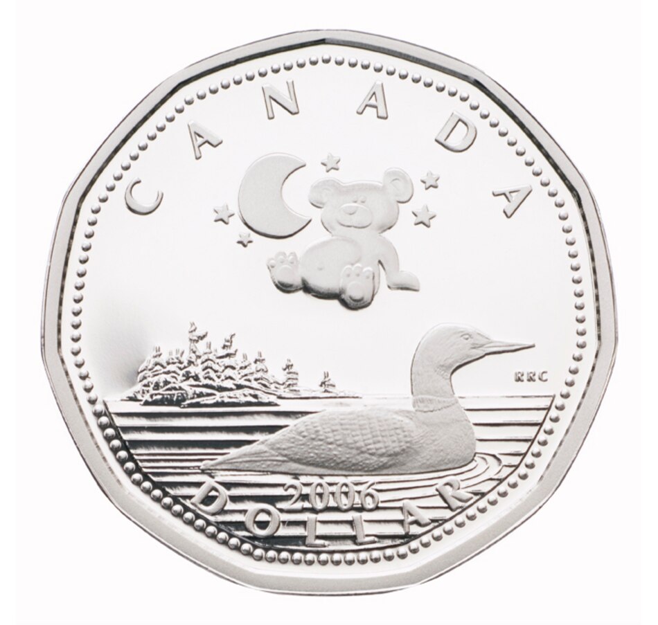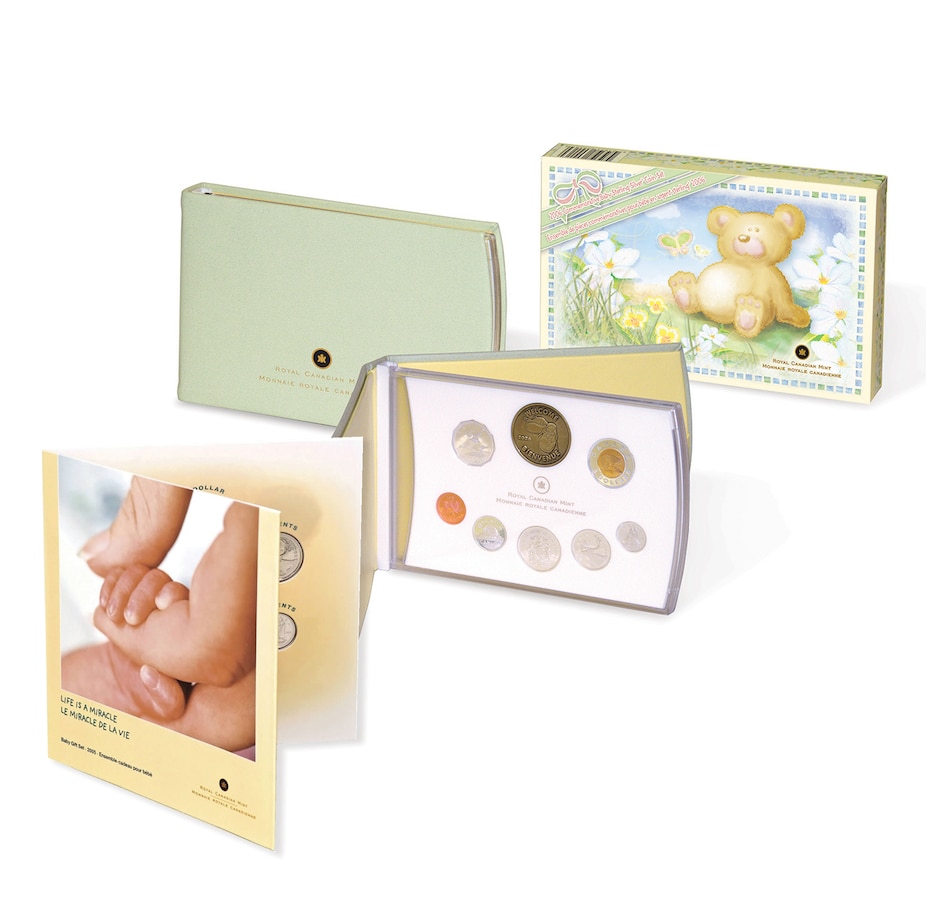 This is a premium-proof silver collector set originally designed by the Royal Canadian Mint as a high-quality gift for a baby born in 2006. It is similar in style and equal in quality to the Prestige Proof Sets issued each year. It includes a special edition Sterling Silver Loon Dollar featuring a traditional loon design together with a teddy bear, a crescent moon and several stars. It also includes one-cent, five-cent, 10-cent and 25-cent coins double-struck in sterling silver with a proof cameo finish. The set is completed with a unique teddy bear medallion struck in coinage bronze.